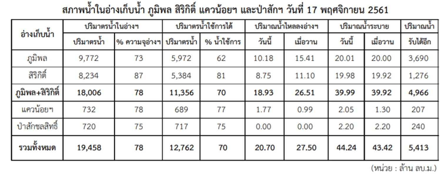 - ปริมาณน้ำใช้การได้ในอ่างเก็บน้ำหลักของแม่น้ำเจ้าพระยา ได้แก่ เขื่อนภูมิพล เขื่อนสิริกิติ์ เขื่อนแควน้อยบำรุงแดน และเขื่อนป่าสักชลสิทธิ์ มีปริมาณทั้งสิ้น 12,762 ล้าน ลบ.ม. น้อยกว่าวันเดียวกันของปี 2560 จำนวน 1,558 ล้าน ลบ.ม. และในช่วงนี้จะพบว่ามีปริมาณน้ำไหลลงอ่างรวมประมาณ 20.70 ล้าน ลบ.ม. ต่อวัน ขณะที่ปริมาณน้ำระบายอยู่ที่ประมาณ 44.24 ล้าน ลบ.ม. ต่อวัน