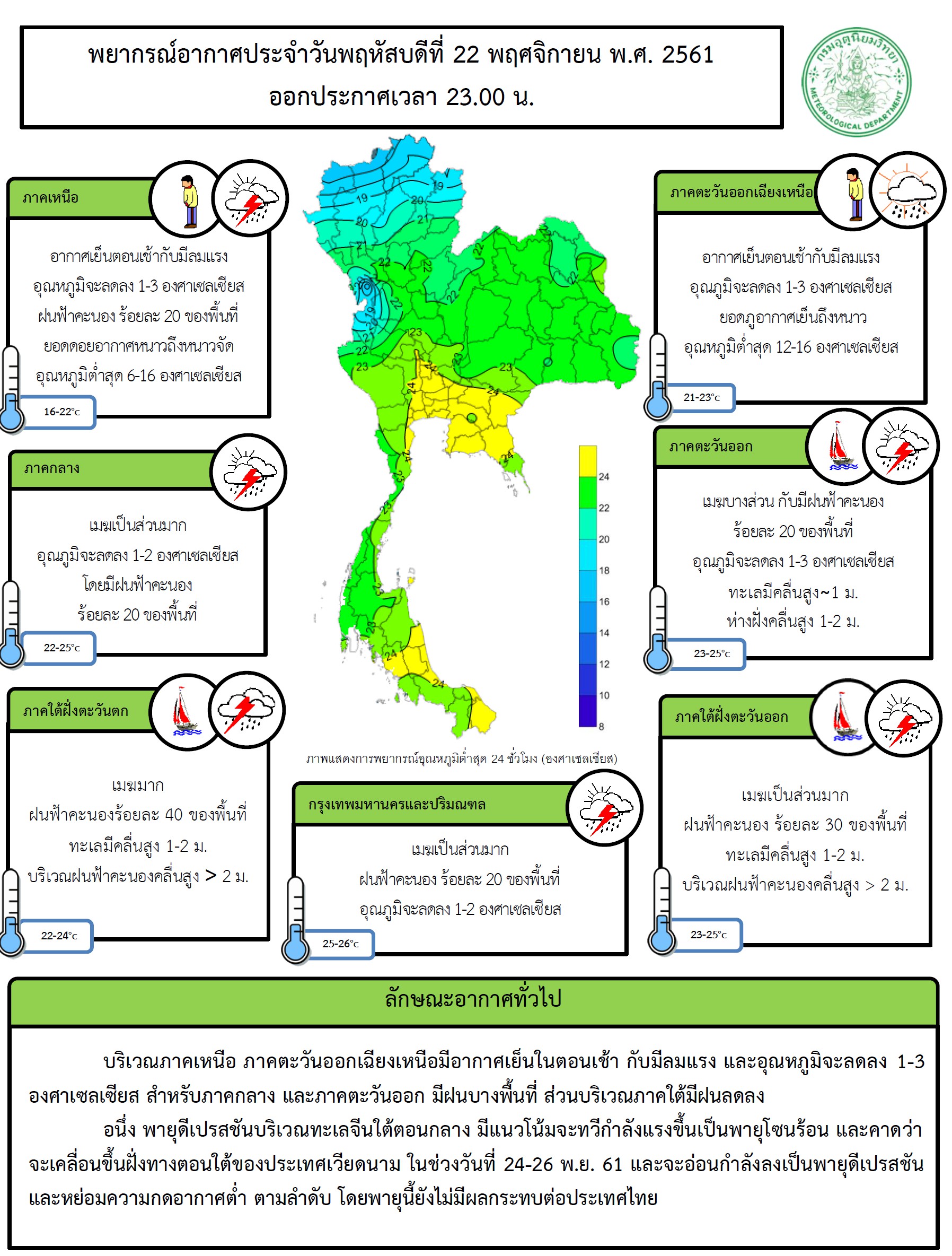 - พยากรณ์อากาศ 24 ชั่วโมงข้างหน้า บริเวณภาคเหนือ ภาคตะวันออกเฉียงเหนือมีอากาศเย็นในตอนเช้า กับมีลมแรง และอุณหภูมิจะลดลง 1-3 องศาเซลเซียส สำหรับภาคกลาง และภาคตะวันออก มีฝนบางพื้นที่ ส่วนบริเวณภาคใต้มีฝนลดลง อนึ่ง พายุโซนร้อน “อุซางิ” (Usagi) ในทะเลจีนใต้ตอนกลางกำลังเคลื่อนตัวทางทิศตะวันตกค่อนทางใต้เล็กน้อยด้วยความเร็ว ประมาณ 20 กิโลเมตรต่อชั่วโมง และคาดว่าในช่วงวันที่ 24-26 พ.ย. 61 พายุนี้จะเคลื่อนเข้าใกล้ชายฝั่งทางตอนใต้ของประเทศเวียดนาม และจะอ่อนกำลังลงตามลำดับ โดยพายุนี้ยังไม่มีผลกระทบต่อประเทศไทย