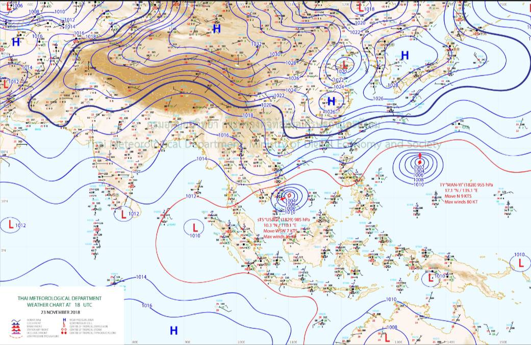 - พยากรณ์อากาศ 24 ชั่วโมงข้างหน้า บริเวณภาคเหนือ ภาคตะวันออกเฉียงเหนือ และภาคกลางมีอากาศเย็น อุณหภูมิจะลดลง 1-2 องศาเซลเซียสอนึ่ง พายุโซนร้อน “อุซางิ” (Usagi) บริเวณทะเลจีนใต้ตอนกลาง โดยมีศูนย์กลางอยู่ทางด้านตะวันออกของเมืองโฮจิมินห์ ประเทศเวียดนามประมาณ 400 กม. กำลังเคลื่อนตัวทางทิศตะวันตกด้วยความเร็ว ประมาณ 15 กม./ชม. คาดว่าจะเคลื่อนขึ้นฝั่งเมืองโฮจิมินห์ ประเทศเวียดนามในวันที่ 25 – 26 พ.ย. 61 และจะอ่อนกำลังลงตามลำดับ ขอให้ผู้ที่จะเดินทางไปประเทศเวียดนามตรวจสอบสภาพอากาศก่อนออกเดินทาง