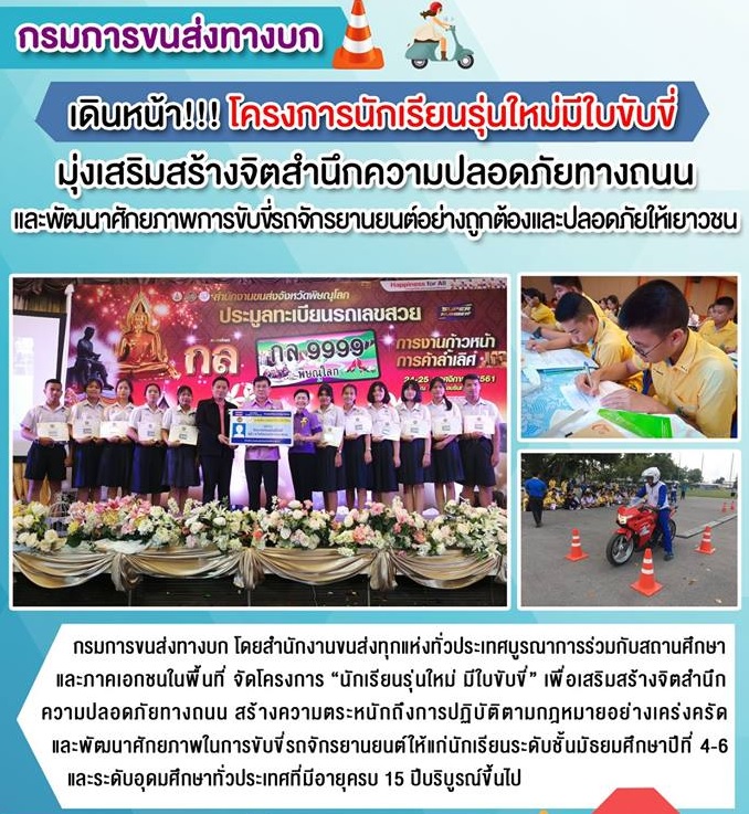 นายพีระพล ถาวรสุภเจริญ อธิบดีกรมการขนส่งทางบก เปิดตัวโครงการนักเรียนรุ่นใหม่มีใบขับขี่ ซึ่งเป็นนโยบายที่มุ่งเน้นการทำกิจกรรมเพื่อส่งเสริมความปลอดภัยบนท้องถนน โดยการสร้างจิตสำนึกความปลอดภัยทางถนน สร้างความตระหนักถึงการปฏิบัติตามกฎหมายอย่างเคร่งครัด และพัฒนาศักยภาพในการขับขี่รถจักรยานยนต์ให้แก่นักเรียนระดับชั้นมัธยมศึกษาตอนปลายและระดับอุดมศึกษาทั่วประเทศ