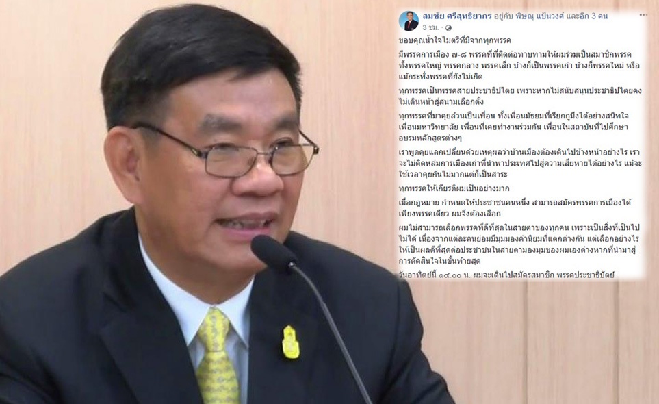 รายงานข่าวจากพรรคประชาธิปัตย์ แจ้งว่า นายสมชัย ศรีสุทธิยากร อดีตคณะกรรมการการเลือกตั้ง (กกต.) ได้ติดต่อกับทางผู้ใหญ่ในพรรคประชาธิปัตย์ โดยแจ้งว่าจะเดินทางไปสมัครเข้าพรรคประชาธิปัตย์ในวันนี้ (25 พ.ย. 61) เวลา 14.00 น. ภายหลังจากที่นายสมชัย ศรีสุทธิยากร ได้ประกาศไว้ก่อนหน้านี้ว่าจะสมัครเป็นสมาชิกพรรคการเมืองพรรคหนึ่ง ที่มีจุดยืนว่าเป็นพรรคการเมืองไม่เอาเผด็จการ พร้อมกับกล่าวถึงประเด็นการแก้รัฐธรรมนูญ 2560 ที่จะดีไซน์ใหม่เพื่อให้เกิดประโยชน์ต่อส่วนรวม
