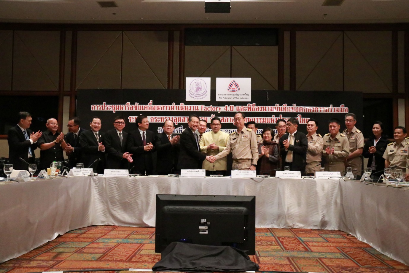 - นายอุตตม สาวนายน รมว.อก. เป็นประธานในพิธีลงนาม MOU ระหว่าง อก. กับ สภาอุตสาหกรรมแห่งประเทศไทย โดยมีเป้าหมายในการพัฒนาภาคธุรกิจอุตสาหกรรมไทยอย่างเป็นระบบ ตามแผนยุทธศาสตร์ “Factory 4.0” สร้างพลังขับเคลื่อนเศรษฐกิจยุคใหม่ รัฐจะสนับสนุนส่งเสริมให้ภาคเอกชนมีประสิทธิภาพการผลิตมากขึ้น ช่วยลดต้นทุนและความยุ่งยากในการใช้บริการกับภาครัฐลงให้มากที่สุด เช่น การยกเลิกการต่ออายุใบ ร.ง.4 แต่ในขณะเดียวกันผู้ประกอบการโรงงานต้องใส่ใจและดูแลองค์ประกอบสำคัญของเศรษฐกิจฐานรากอีก 3 ส่วนคือ 1. สิ่งแวดล้อมในพื้นที่ ต้องมีการดูแลอย่างจริงจัง โดยมิติใหม่ของโรงงานจะเป็น “ผู้สร้างไม่ใช่ผู้ทำลาย” 2. การพัฒนาชุมชนให้ให้เข้มแข็งมี “ทุนสะสม” ที่ชุมชนจะใช้หล่อเลี้ยงเศรษฐกิจของเขาได้เอง และ 3. การพัฒนาคนในโรงงานและในชุมชนให้มีคุณภาพชีวิตและความเป็นอยู่ที่ดีขึ้น สร้างงานและอาชีพเสริมที่เชื่อมโยงหรือจ้างช่วงจากโรงงาน โดยเฉพาะผู้สูงวัยในภาคการผลิตที่จะกลับสู่ชุมชน ต้องอยู่ได้โดย “ไม่เป็นภาระลูกหลาน”