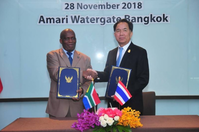 - ที่โรงแรมอมารี ประตูน้ำ นายกฤษฎา บุญราช รมว.กษ. ได้ร่วมลงนามบันทึกความเข้าใจว่าด้วยความร่วมมือด้านการเกษตร กับกระทรวงเกษตรป่าไม้และประมง แห่งสาธารณรัฐแอฟริกาใต้ กล่าวว่าจะเป็นกลไกสำคัญของสองประเทศเพื่อสนับสนุนทางวิชาการด้านการเกษตรทุกสาขา พร้อมกับการแก้ไขปัญหาสินค้าเกษตร รวมทั้งขยายโอกาสทางการค้าเชื่อมโยงความสัมพันธ์ระหว่างภูมิภาคเอเชียและแอฟริกา ในขณะนี้ประเทศแอฟริกาใต้สนใจที่จะขยายตลาดและเพิ่มมูลค่าสินค้าเกษตรจากไทย อาทิ ไก่แปรรูป ลำไย มังคุด และยางพารา รวมทั้งสนใจการเพาะเลี้ยงสัตว์น้ำจืดของไทย