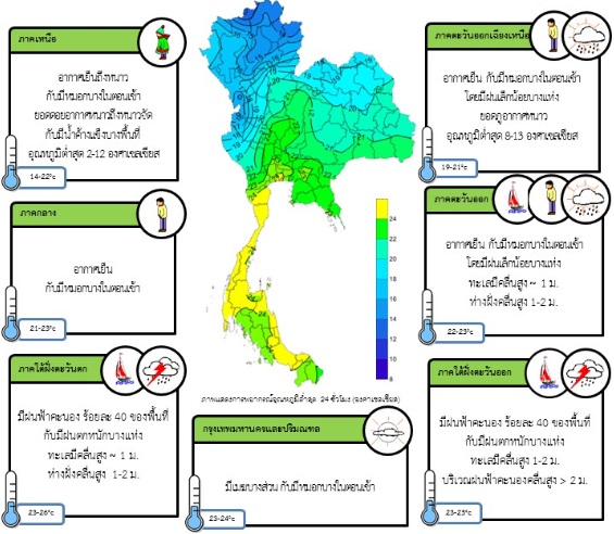 - พยากรณ์อากาศ 24 ชั่วโมงข้างหน้า บริเวณภาคเหนืออากาศเย็นถึงหนาว ส่วนภาคตะวันออกเฉียงเหนือ ภาคกลาง และภาคตะวันออก มีอากาศเย็นกับมีหมอกบางในตอนเช้า โดยมีฝนเล็กน้อยบางแห่งบริเวณภาคตะวันออกเฉียงเหนือและภาคตะวันออก บริเวณยอดดอยมีอากาศหนาวถึงหนาวจัดกับมีน้ำค้างแข็งบางพื้นที่ ขอให้ประชาชนบริเวณภาคเหนือดูแลสุขภาพเนื่องจากสภาพอากาศที่หนาวเย็นลงด้วย สำหรับภาคใต้มีฝนตกต่อเนื่องกับมีฝนตกหนักบางแห่ง กรุงเทพมหานครและปริมณฑลมีเมฆเป็นส่วนมากกับมีหมอกบางในตอนเช้า อุณหภูมิต่ำสุด 23-24 องศาเซลเซียส อุณหภูมิสูงสุด 32-33 องศาเซลเซียส ลมตะวันออกเฉียงเหนือ ความเร็ว 15-30 กม./ชม.