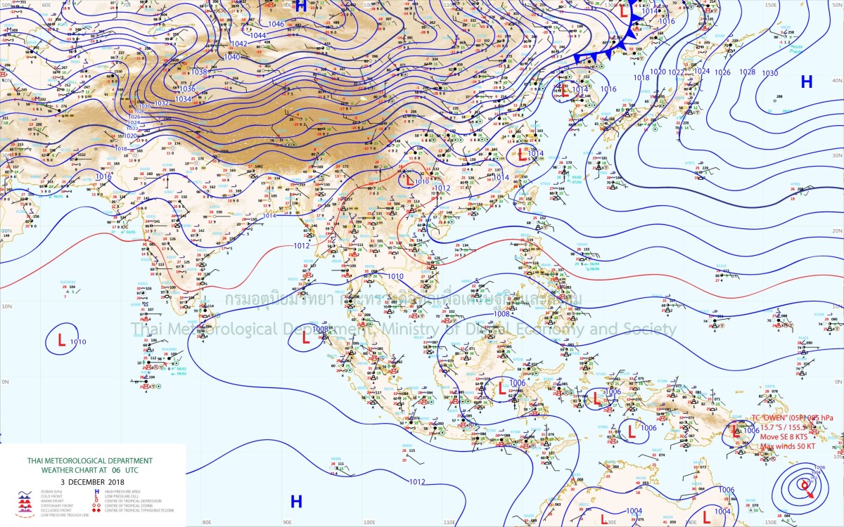 - พยากรณ์อากาศ 24 ชั่วโมงข้างหน้า ประเทศไทยตอนบนมีหมอกในตอนเช้ากับมีหมอกหนาในบางพื้นที่ และมีฝนฟ้าคะนองบางแห่ง ส่วนภาคเหนือตอนบนและภาคตะวันออกเฉียงเหนือตอนบนยังคงมีอากาศเย็นในตอนเช้า ขอให้ประชาชนบริเวณประเทศไทยตอนบนระวังอันตรายการสัญจรผ่านบริเวณที่มีหมอกหนาไว้ด้วย สำหรับภาคใต้ยังคงมีฝนฟ้าคะนองบางพื้นที่ สำหรับกรุงเทพฯ และปริมณฑล มีเมฆบางส่วน กับมีหมอกบางในตอนเช้า โดยมีฝนเล็กน้อยบางแห่ง อุณหภูมิต่ำสุด 24-27 องศาเซลเซียส อุณหภูมิสูงสุด 34-36 องศาเซลเซียส ลมตะวันออกเฉียงเหนือ ความเร็ว 10-30 กม./ชม.