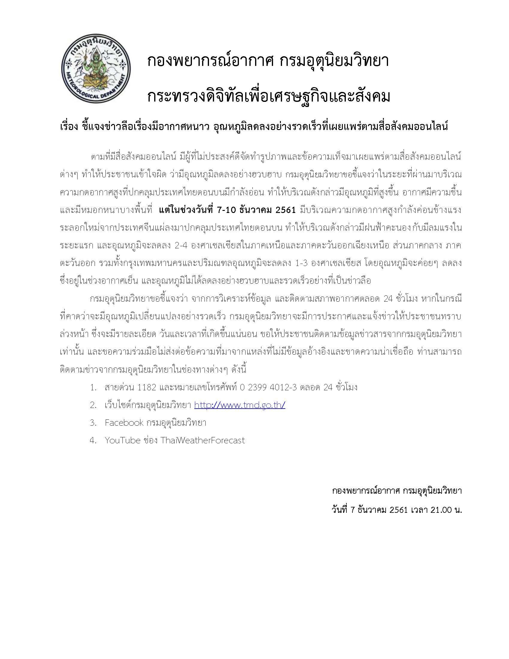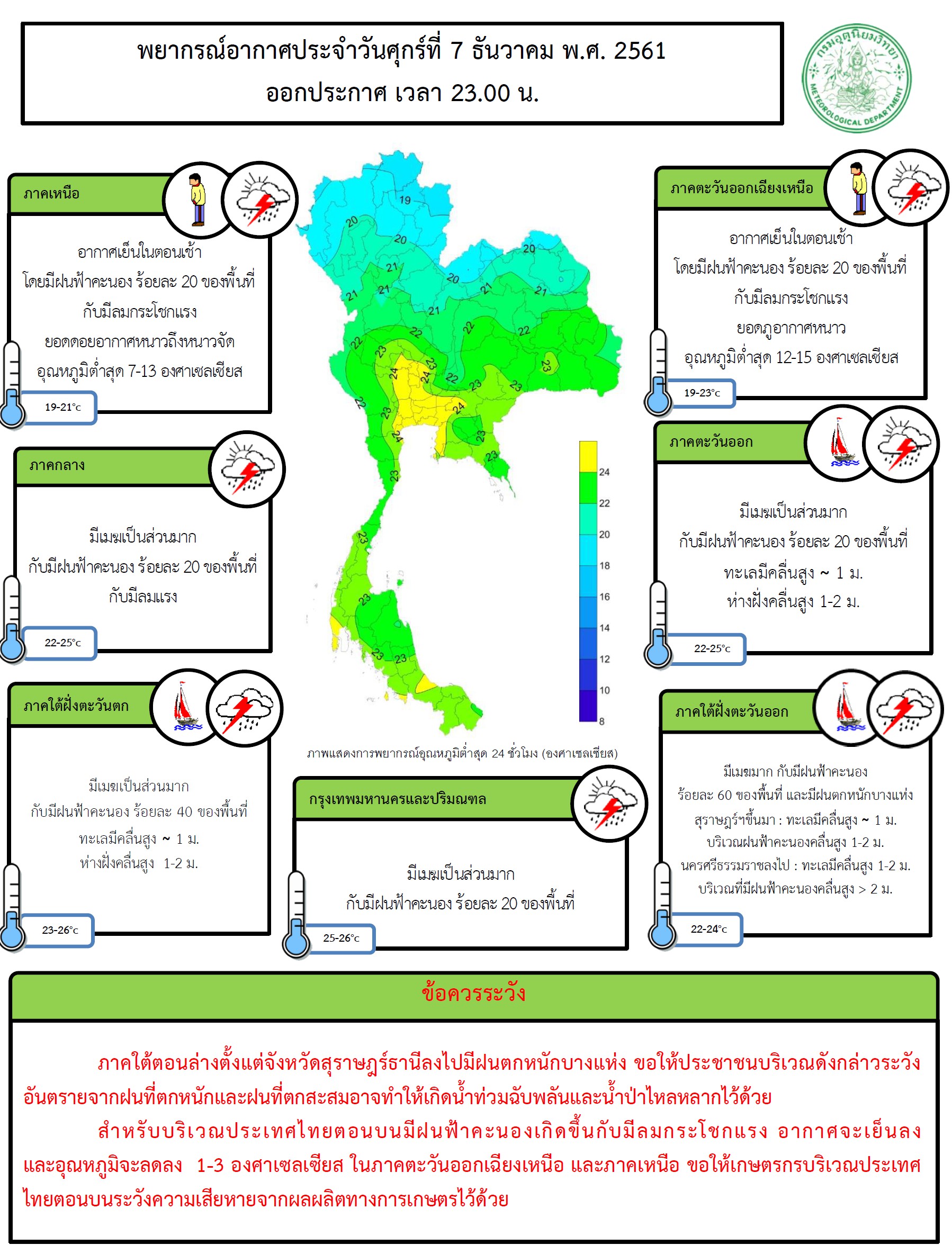 - พยากรณ์อากาศ 24 ชั่วโมงข้างหน้า บริเวณภาคเหนือ ภาคตะวันออกเฉียงเหนือ ภาคกลาง ภาคตะวันออก รวมทั้งกรุงเทพมหานครและปริมณฑลมีฝนฟ้าคะนองเกิดขึ้น ขอให้เกษตรกรบริเวณประเทศไทยตอนบนระวังความเสียหายจากผลผลิตทางการเกษตรไว้ด้วย สำหรับภาคใต้ตอนล่างยังคงมีฝนตกหนักบางแห่ง ขอให้ประชาชนบริเวณดังกล่าวระวังอันตรายจากฝนที่ตกหนักและฝนที่ตกสะสมอาจทำให้เกิดน้ำท่วมฉับพลันและน้ำป่าไหลหลากไว้ด้วย