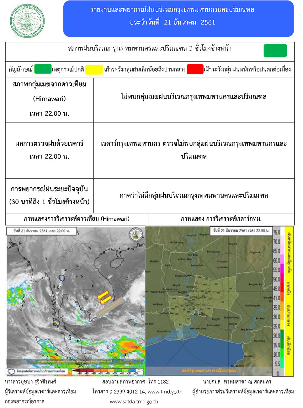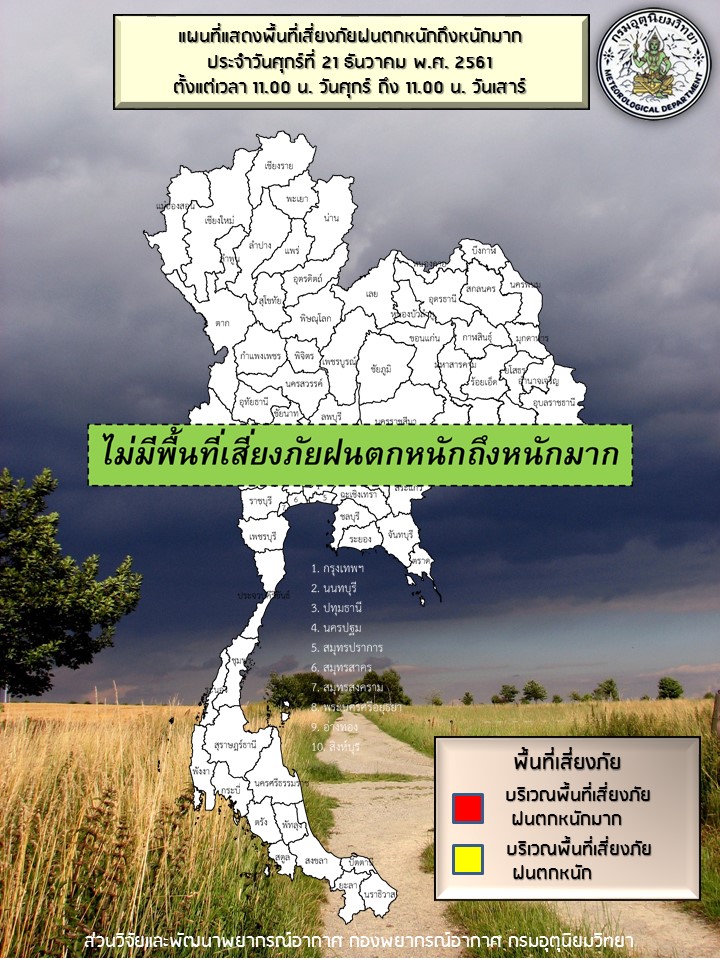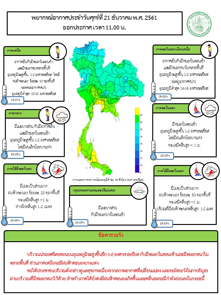 - บริเวณประเทศไทยตอนบนอุณหภูมิจะสูงขึ้นอีก 1-2 องศาเซลเซียส กับมีหมอกในตอนเช้าและมีหมอกหนาในหลายพื้นที่ ส่วนภาคเหนือจะมีฝนฟ้าคะนองบางแห่ง ขอให้ประชาชนบริเวณดังกล่าวดูแลสุขภาพเนื่องจากสภาพอากาศที่เปลี่ยนแปลง และระมัดระวังในการสัญจรผ่านบริเวณที่มีหมอกหนาไว้ด้วย สำหรับภาคใต้ยังคงมีฝนฟ้าคะนองเกิดขึ้นและคลื่นลมจะมีกำลังอ่อนลงในระยะนี้