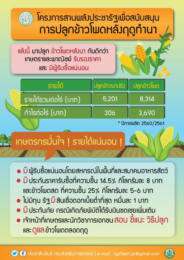 - นายลักษณ์ วจนานวัช รมช.กษ. เปิดเผยหลังเป็นประธานพิธีลงนามบันทึกความร่วมมือโครงการสานพลังประชารัฐ เพื่อสนับสนุนการปลูกข้าวโพดหลังฤดูทำนา ปี 2561/2562 ว่า โครงการดังกล่าวจะช่วยให้เกษตรกรที่ปลูกข้าวโพดหลังการทำนา สามารถขายได้ในราคาที่ดี เพราะได้รับความช่วยเหลือจากภาคเอกชนเข้ามารับซื้อผลผลิตตามนโยบายการตลาดนำการผลิต อีกทั้งนายกรัฐมนตรีได้สั่งให้ฝ่ายความมั่นคงคุมเข้มแนวชายแดน ไม่ให้มีการลักลอบขนสินค้าการเกษตรเข้ามาฝั่งไทยอย่างเด็ดขาด จึงเชื่อว่าจะไม่มีข้าวโพดลักลอบเข้ามาทำให้ราคาตกต่ำ ปัจจุบันมีเกษตรกรมาเข้าโครงการจำนวน 9.52 หมื่นราย รวมเป็นพื้นที่ 8.07 แสนไร่ จากเป้าหมาย 2 ล้านไร่ ซึ่งจะครบกำหนดรับสมัครวันสุดท้ายวันที่ 15 ม.ค. 2562 คาดว่าจะมีเกษตรกรมาเข้าร่วมเพิ่ม เพราะมั่นใจกับมาตรการที่รัฐออกมาช่วยเหลือ ทั้งการจับคู่ซื้อขาย การดูแลแปลงและราคารับซื้อที่ได้ราคาดี จากการปลูกในเวลาที่เหมาะสม และข้าวโพดเลี้ยงสัตว์ยังเป็นวัตถุดิบที่ไม่พอต่อความต้องการใช้ในประเทศ เพราะขาดแคลนประมาณ 2-3 ล้านตัน/ปี ทำให้ราคาไม่ตกต่ำ