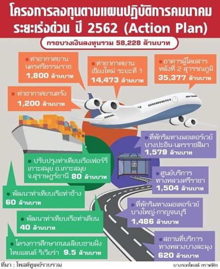 - คมนาคมกดดันหน่วยงานในสังกัดเร่งเบิกจ่ายงบปี 2561 มูลค่า 3.8 หมื่นล้าน เอกชนหวังโครงการรัฐผลักดัน จีดีพีปี 2562 นายชัยวัฒน์ ทองคำคูณ ปลัดกระทรวงคมนาคม เปิดเผยภายหลังการประชุมติดตามงบประมาณของกระทรวงคมนาคม ว่า กระทรวงคมนาคมสั่งการให้หน่วยงานที่เกี่ยวข้องและหน่วยงานรัฐวิสาหกิจ ภายใต้สังกัดกระทรวงคมนาคมเร่งรัดการเบิกจ่ายงบประมาณเหลือค้างหรืองบค้างท่อ ระหว่างปี 2556-2561 รวมระยะเวลา 6 ปี วงเงินทั้งสิ้น 3.86 หมื่นล้านบาท เพื่อส่งเสริมการขับเคลื่อนการลงทุนของภาครัฐ ดังนั้นจึงได้ตั้งเป้าหมายให้ทุกหน่วยงานเร่งเบิกจ่ายงบค้างท่อดังกล่าวภายในเดือน ก.ย. 2562 ก่อนเป้าหมายที่สำนักงบประมาณกำหนดไว้ในช่วงปลายปี 2563 นอกจากนี้ ยังมีโครงการลงทุนระยะเร่งด่วนที่ริเริ่มผลักดันในปี 2562 ซึ่งเป็นโครงการใหม่อีก 12 โครงการ วงเงินลงทุน 5.8 หมื่นล้านบาท โดยกระทรวงฯ จะเสนอให้คณะกรรมการนโยบายการให้เอกชนร่วมลงทุนในโครงการของรัฐ ก่อนเสนอเข้าสู่การพิจารณาของ ครม.ต่อไป