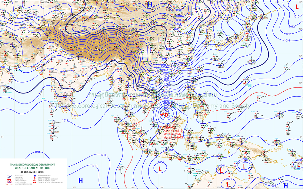 - พยากรณ์อากาศ 24 ชั่วโมงข้างหน้า ประเทศไทยตอนบนมีอากาศหนาวเย็นโดยทั่วไปและมีลมแรง อุณหภูมิจะลดลง 2-4 องศาเซลเซียสในภาคเหนือ ส่วนบริเวณเทือกเขาสูงมีอากาศหนาวถึงหนาวจัด อุณหภูมิต่ำสุด 2-12 องศาเซลเซียส และมีน้ำค้างแข็งเกิดขึ้นบางพื้นที่ สำหรับภาคตะวันออกเฉียงเหนือ ภาคกลาง ภาคตะวันออก รวมทั้งกรุงเทพมหานครและปริมณฑล อุณหภูมิจะลดลง 1-3 องศาเซลเซียส ขอให้ประชาชนบริเวณประเทศไทยตอนบนรักษาสุขภาพเนื่องจากสภาพอากาศที่หนาวเย็นลงไว้ด้วย สำหรับภาคใต้ตั้งแต่จังหวัดสุราษฎร์ธานีลงไปจะมีฝนเพิ่มขึ้นกับมีฝนตกหนักบางแห่ง ขอให้ประชาชนบริเวณภาคใต้ระวังอันตรายจากฝนที่ตกหนักไว้ด้วย ส่วนอ่าวไทยจะมีคลื่นลมแรง โดยมีคลื่นสูง 2-3 เมตร ชาวเรือควรเดินเรือด้วยความระมัดระวัง เรือเล็กบริเวณอ่าวไทยควรงดออกจากฝั่งจนถึงวันที่ 5 ม.ค. 2562