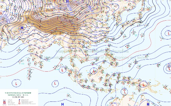 - ภาคเหนือและภาคตะวันออกเฉียงเหนือ อากาศเย็น มีหมอกในตอนเช้าและมีหมอกหนาในบางพื้นที่ อุณหภูมิต่ำสุด 17-22 องศาเซลเซียส ภาคกลางและภาคตะวันออก มีเมฆบางส่วนและมีหมอกในตอนเช้า อุณหภูมิต่ำสุด 22-25 องศาเซลเซียส ภาคใต้ฝั่งตะวันออก มีเมฆบางส่วน กับมีฝนฟ้าคะนอง ร้อยละ 30 ของพื้นที่ อุณหภูมิต่ำสุด 23-26 องศาเซลเซียส ภาคใต้ฝั่งตะวันตก มีเมฆบางส่วน กับมีฝนฟ้าคะนอง ร้อยละ 20 ของพื้นที่ อุณหภูมิต่ำสุด 23-26 องศาเซลเซียส กรุงเทพฯ และปริมณฑล มีเมฆบางส่วนและมีหมอกในตอนเช้า อุณหภูมิต่ำสุด 25-26 องศาเวลเซียส