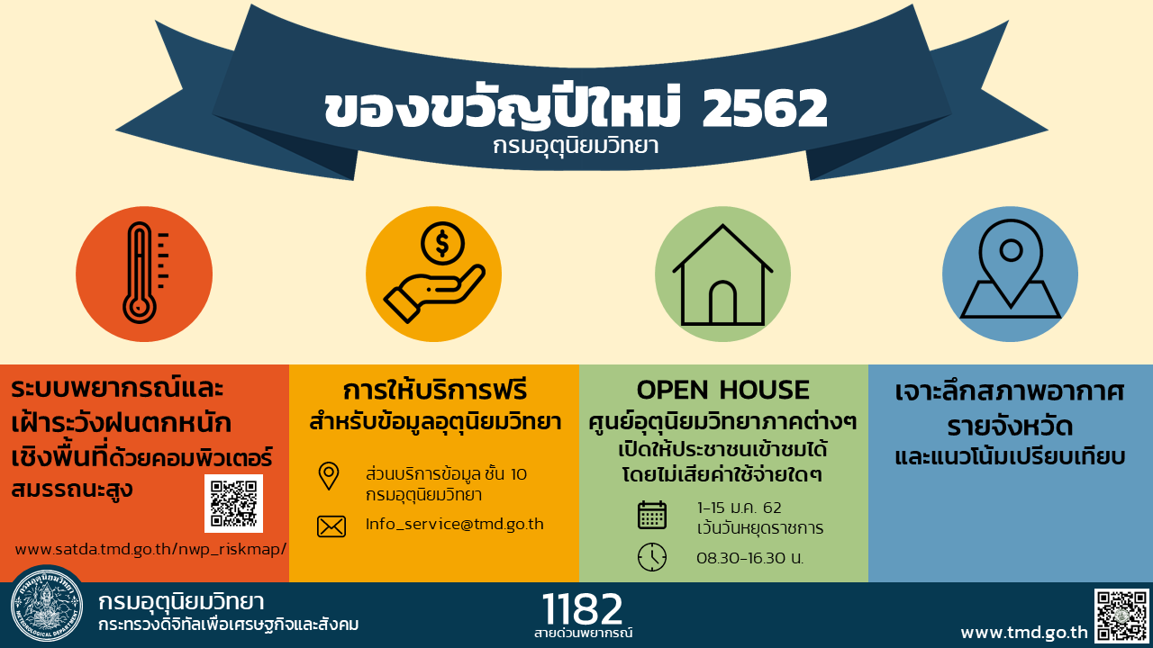 - วันที่ 15-16 ม.ค. 62 บริเวณประเทศไทยตอนบนมีหมอกในตอนเช้า และมีหมอกหนาในหลายพื้นที่ โดยมีฝนฟ้าคะนองบางแห่ง มีอากาศเย็นในภาคเหนือและภาคตะวันออกเฉียงเหนือ สำหรับภาคใต้มีฝน ส่วนในช่วงวันที่ 17-21 ม.ค. 62 ประเทศไทยตอนบนจะมีอากาศเย็น อุณหมิจะลดลง 2-4 องศา ส่วนภาคใต้มีฝนเพิ่มขึ้น