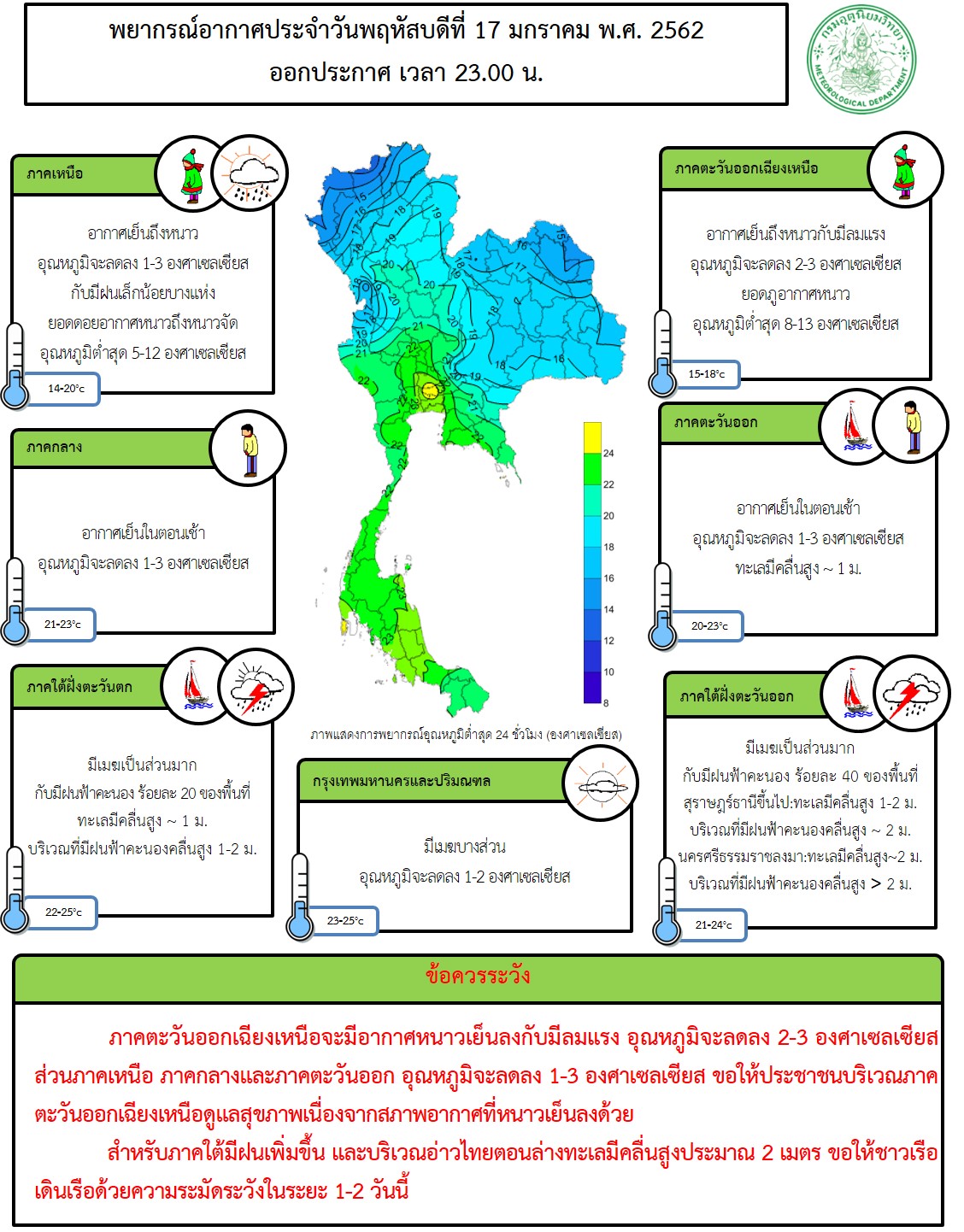 - ภาคตะวันออกเฉียงเหนือจะมีอากาศหนาวเย็นลงกับมีลมแรง อุณหภูมิจะลดลงอีก 1-3 องศาเซลเซียส ส่วนภาคเหนือ ภาคกลางและภาคตะวันออก อุณหภูมิจะลดลงอีก 1-2 องศาเซลเซียส ขอให้ประชาชนบริเวณภาคตะวันออกเฉียงเหนือดูแลสุขภาพเนื่องจากสภาพอากาศที่หนาวเย็นลงด้วย สำหรับภาคใต้มีฝนตกต่อเนื่อง และบริเวณอ่าวไทยตอนล่างทะเลมีคลื่นสูงประมาณ 2 เมตร ขอให้ชาวเรือเดินเรือด้วยความระมัดระวังในระยะ 1-2 วันนี้
