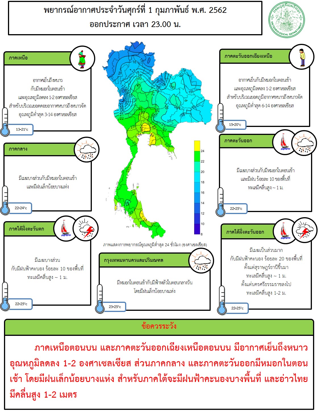 - ภาคเหนือตอนบนและภาคตะวันออกเฉียงเหนือตอนบน มีอากาศเย็นถึงหนาว ส่วนภาคกลาง และภาคตะวันออกมีหมอกในตอนเช้า โดยมีฝนเล็กน้อยบางแห่ง สำหรับภาคใต้จะมีฝนฟ้าคะนองบางพื้นที่ และอ่าวไทยมีคลื่นสูง 1-2 เมตร