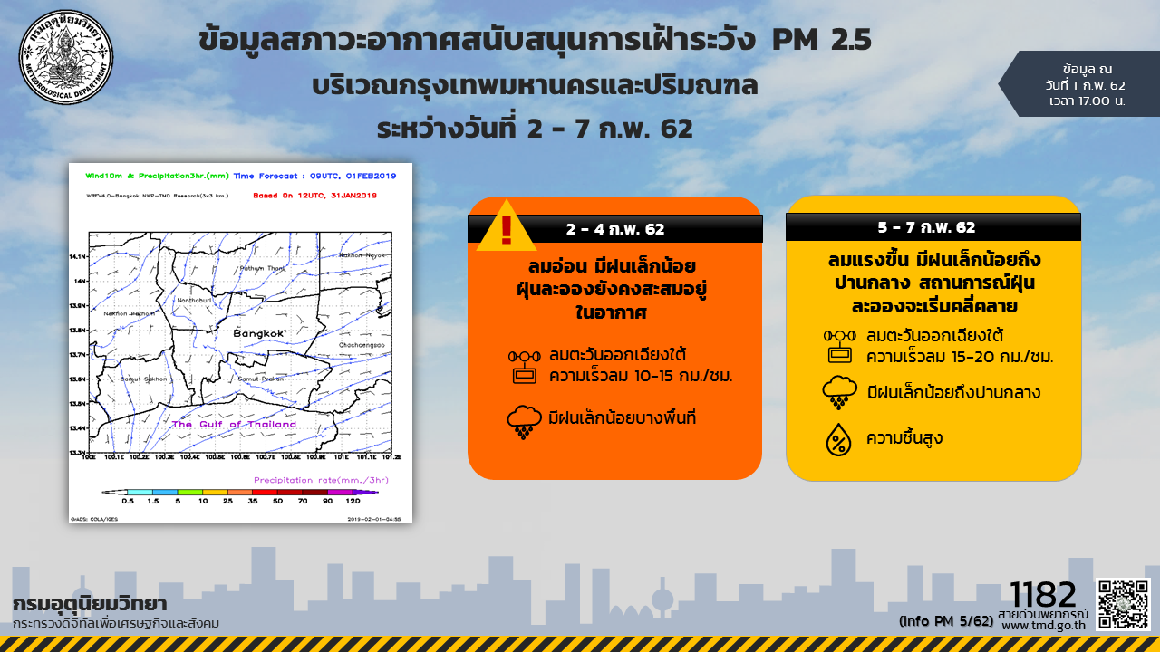 - ทส. สรุปผลประชุมพิจารณามาตรการแก้ปัญหา PM2.5 จากยานพาหนะในพื้นที่ กทม. และปริมณฑล รวม 12 มาตราการระยะเร่งด่วน-ระยะยาว เสนอบอร์ดสิ่งแวดล้อม 4 ก.พ.นี้ โดยแบ่งเป็น 2 ระยะ คือ มาตรการเร่งด่วน ได้แก่ การห้ามรถยนต์ที่มีมลพิษสูงวิ่งเข้าพื้นที่ กทม. ชั้นกลางและชั้นนอก การเร่งรัดให้นำน้ำมันดีเซลกำมะถันต่ำกว่า 10 พีพีเอ็ม (เทียบเท่า ยูโร 5) มาจำหน่ายในพื้นที่ กทม. และปริมณฑล ให้หน่วยงานภาครัฐ พิจารณาการทำงานที่บ้านและขอความร่วมมือจากบริษัทเอกชนให้ทำงานที่บ้านเช่นเดียวกัน เพิ่มความเข้มงวดในการตรวจสภาพรถยนต์ประจำปี และเพิ่มความเข้มงวดในการตรวจวัดควันดำจากรถยนต์และการบังคับใช้คำสั่งห้ามใช้ และมาตรการระยะกลางและระยะยาว ได้แก่ ปรับปรุงมาตรฐานน้ำมันเชื้อเพลิงให้มีกำมะถันไม่เกิน 10 ppm (เทียบเท่ามาตรฐาน ยูโร 5) ปรับปรุงมาตรฐานการระบายมลพิษทางอากาศจากรถยนต์ใหม่ให้เป็นไปตามมาตรฐาน ยูโร 6 ปรับปรุงค่ามาตรฐาน PM2.5 เฉลี่ยรายปีให้เป็นไปตามข้อเสนอแนะของ WHO เร่งรัดแผนการเปลี่ยนรถโดยสาร ขสมก. ให้เป็นรถยนต์ที่มีมลพิษต่ำ ปรับปรุงวิธีการและ ระยะเวลาการตรวจสภาพรถยนต์ประจำปี ควบคุมการนำเครื่องยนต์ใช้แล้วมาเปลี่ยนแทนเครื่องยนต์เก่าในรถยนต์ รวมทั้งดำเนินการศึกษาความเหมาะสมในการติดตั้ง Diesel Particulate Filter ในรถยนต์ใช้งาน