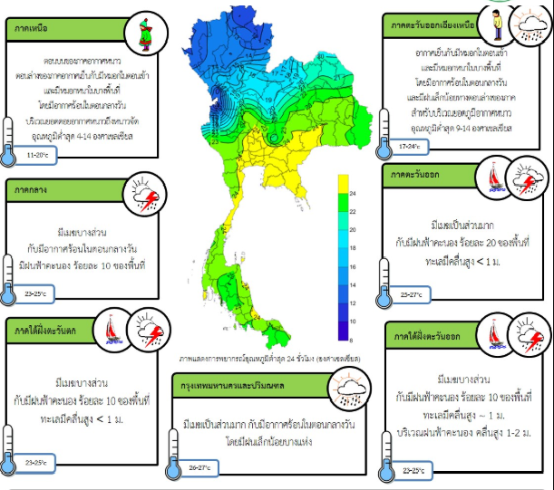 พยากรณ์อากาศ 24 ชั่วโมงข้างหน้า ภาคเหนือมีอากาศเย็นถึงหนาวกับมีหมอกในตอนเช้า บริเวณประเทศไทยตอนบนมีอากาศร้อนในตอนกลางวัน สำหรับภาคตะวันออกเฉียงเหนือตอนล่าง ภาคกลางตอนล่าง และภาคตะวันออก มีฝนบางพื้นที่ ขอให้ประชาชนระวังอันตรายในการสัญจรผ่านบริเวณที่มีหมอกหนาไว้ด้วย ส่วนภาคใต้ยังคงมีฝนฟ้าคะนองบางแห่ง