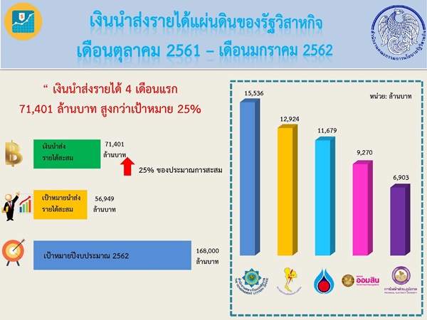 - นายประภาศ คงเอียด ผู้อำนวยการสำนักงานคณะกรรมการนโยบายรัฐวิสาหกิจ (สคร.) เปิดเผยว่า ในช่วง 4 เดือนแรกของปีงบประมาณ 2562 (ต.ค. 61 – ม.ค. 62) สคร. สามารถจัดเก็บเงินนำส่งรายได้แผ่นดินจากรัฐวิสาหกิจและกิจการที่กระทรวงการคลังถือหุ้นต่ำกว่าร้อยละ 50 จำนวน 71,401 ล้านบาท ซึ่งสูงกว่าประมาณการเงินนำส่งรายได้แผ่นดินสะสมจำนวน 14,452 ล้านบาท หรือร้อยละ 25 ของประมาณการสะสม รัฐวิสาหกิจที่นำส่งรายได้แผ่นดินสูงสุด 5 อันดับแรก ในช่วง 4 เดือนแรกของปีงบประมาณ 2562 ได้แก่ สำนักงานสลากกินแบ่งรัฐบาล การไฟฟ้าฝ่ายผลิตแห่งประเทศไทย บริษัท ปตท. จำกัด (มหาชน) ธนาคารออมสิน และการไฟฟ้าส่วนภูมิภาค รวมจำนวน 56,313 ล้านบาท คิดเป็นร้อยละ 79 ของเงินนำส่งรายได้แผ่นดินสะสมทั้งหมด