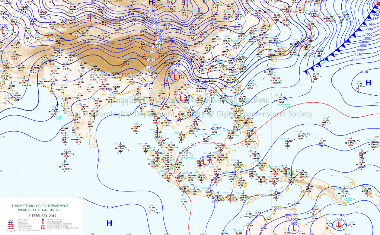 - ประเทศไทยตอนบนมีอากาศร้อนในตอนกลางวัน โดยมีฝนฟ้าคะนองบางแห่งในภาคตะวันออกเฉียงเหนือ ภาคกลาง และภาคตะวันออก สำหรับภาคเหนือและภาคตะวันออกเฉียงเหนือตอนบนยังคงมีอากาศเย็นถึงหนาว กับมีหมอกในตอนเช้าและมีหมอกหนาในบางพื้นที่ ขอให้ประชาชนบริเวณภาคเหนือระวังอันตรายในการสัญจรผ่านบริเวณที่มีหมอกหนาไว้ด้วย ส่วนภาคใต้มีฝนฟ้าคะนองบางพื้นที่ อนึ่ง ในช่วงวันที่ 10 – 13 ก.พ. 62 บริเวณความกดอากาศสูงจากประเทศจีนจะแผ่ปกคลุมประเทศไทยตอนบน ทำให้มีฝนฟ้าคะนองเกิดขึ้นในระยะแรกกับมีลมกระโชกแรง หลังจากนั้นอุณหภูมิจะลดลง 2-4 องศาเซลเซียส ในภาคตะวันออกเฉียงเหนือ ภาคกลาง และภาคตะวันออก ส่วนภาคใต้มีฝนเพิ่มขึ้น และบริเวณอ่าวไทยมีคลื่นสูงประมาณ 2 เมตร ขอให้ประชาชนบริเวณประเทศไทยตอนบนดูแลสุขภาพเนื่องจากสภาพอากาศที่เปลี่ยนแปลงและมีลมแรงไว้ด้วย