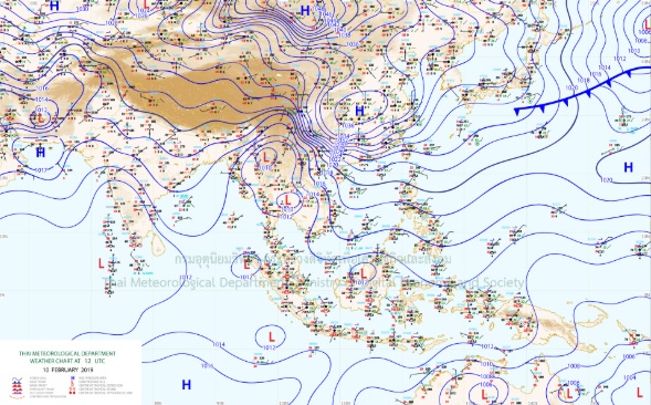 - ประเทศไทยตอนบนมีอากาศร้อนในตอนกลางวัน โดยมีฝนฟ้าคะนองกับมีลมกระโชกแรงบางแห่ง ในภาคตะวันออกเฉียงเหนือ ภาคกลางและภาคตะวันออก สำหรับภาคเหนือและภาคตะวันออกเฉียงเหนือตอนบนยังคงมีอากาศเย็นถึงหนาว กับมีหมอกในตอนเช้าและมีหมอกหนาในบางพื้นที่ ขอให้ประชาชนบริเวณประเทศไทยตอนบนระวังอันตรายจากลมกระโชกแรงและดูแลสุขภาพเนื่องจากสภาพอากาศที่เปลี่ยนแปลงไว้ด้วย และสำหรับประชาชนบริเวณภาคเหนือระวังอันตรายในการสัญจรผ่านบริเวณที่มีหมอกหนาในระยะนี้ ส่วนภาคใต้มีฝนฟ้าคะนองบางพื้นที่ อนึ่ง ในช่วงวันที่ 11 – 13 ก.พ. 62 บริเวณความกดอากาศสูงกำลังค่อนข้างแรงอีกระลอกหนึ่งจากประเทศจีนจะแผ่ลงมาปกคลุมประเทศไทยตอนบนและทะเลจีนใต้ ในขณะที่ประเทศไทยตอนบนมีอากาศร้อนในตอนกลางวัน ประกอบกับมีลมตะวันออกเฉียงใต้พัดนำความชื้นเข้ามาปกคลุมประเทศไทยตอนบน ลักษณะเช่นนี้ทำให้บริเวณดังกล่าวมีฝนฟ้าคะนองกับมีลมกระโชกแรงเกิดขึ้นในระยะแรก หลังจากนั้นอุณหภูมิจะลดลง 1-3 องศาเซลเซียส ในภาคตะวันออกเฉียงเหนือ ภาคกลาง และภาคตะวันออก ส่วนภาคใต้มีฝนเพิ่มขึ้น และบริเวณอ่าวไทยมีคลื่นสูงประมาณ 2 เมตร