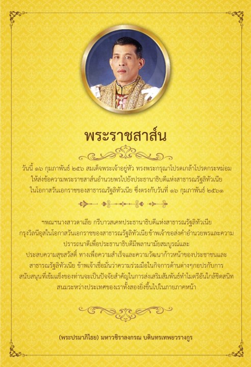 - สมเด็จพระเจ้าอยู่หัว ทรงพระกรุณาโปรดเกล้าฯ ให้ส่งข้อความพระราชสาส์นอำนวยพรไปยังประธานาธิบดีแห่งสาธารณรัฐลิทัวเนีย ในโอกาสวันเอกราชของสาธารณรัฐลิทัวเนีย ซึ่งตรงกับวันที่ 16 ก.พ. 2562 ความว่า ฯพณฯ นางสาวดาเลีย กรีบาวสเคท ประธานาธิบดีแห่งสาธารณรัฐลิทัวเนีย กรุงวิลนีอุส ในโอกาสวันเอกราชของสาธารณรัฐลิทัวเนีย ข้าพเจ้าขอส่งคำอำนวยพรและความปรารถนาดี เพื่อท่านประธานาธิบดีมีพลานามัยสมบูรณ์และประสบความสุขสวัสดิ์ ทั้งเพื่อความสำเร็จและความวัฒนาก้าวหน้าของประชาชนและสาธารณรัฐลิทัวเนีย ข้าพเจ้าเชื่อมั่นว่า ความร่วมมือในกิจการด้านต่าง ๆ กอปรกับการสนับสนุนที่เข้มแข็งของท่าน จะเป็นปัจจัยสำคัญในการส่งเสริมสัมพันธไมตรีอันใกล้ชิดสนิทสนมระหว่างประเทศของเราทั้งสองยิ่งขึ้นไปในภายภาคหน้า (พระปรมาภิไธย) มหาวชิราลงกรณ บดินทรเทพยวรางกูร