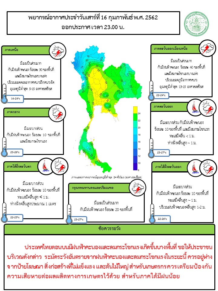- พยากรณ์อากาศ 24 ชั่วโมงข้างหน้า ประเทศไทยตอนบนมีฝนฟ้าคะนองและลมกระโชกแรงเกิดขึ้นบางพื้นที่ ขอให้ประชาชนบริเวณดังกล่าว ระมัดระวังอันตรายจากฝนฟ้าคะนองและลมกระโชกแรงในระยะนี้ ควรอยู่ห่างจากป้ายโฆษณา สิ่งก่อสร้างที่ไม่แข็งแรง และต้นไม้ใหญ่ สำหรับเกษตรกรควรเตรียมป้องกันความเสียหายต่อผลผลิตทางการเกษตรไว้ด้วย ภาคใต้มีฝนน้อย สำหรับ กรุงเทพมหานครและปริมณฑล มีเมฆเป็นส่วนมากกับมีฝนฟ้าคะนอง ร้อยละ 20 ของพื้นที่ อุณหภูมิต่ำสุด 25-27 องศาเซลเซียส อุณหภูมิสูงสุด 32-36 องศาเซลเซียส