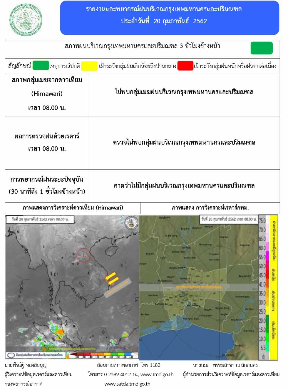 - พยากรณ์อากาศ 24 ชั่วโมงข้างหน้า ภาคเหนือ ภาคตะวันออกเฉียงเหนือตอนบน มีอากาศหนาวเย็นในตอนเช้า ส่วนภาคตะวันออกเฉียงเหนือตอนล่าง ภาคกลาง ภาคตะวันออก และภาคใต้มีฝนฟ้าคะนองบางแห่ง ลมใต้และลมตะวันออกเฉียงใต้พัดปกคลุมภาคตะวันออก ภาคกลาง และภาคตะวันออกเฉียงเหนือตอนล่าง ทำให้บริเวณดังกล่าว มีฝนเกิดขึ้นได้บางพื้นที่ ในขณะที่ลมฝ่ายตะวันตกพัดปกคลุมภาคเหนือและภาคตะวันออกเฉียงเหนือตอนบน ทำให้บริเวณดังกล่าวมีอากาศหนาวเย็นในตอนเช้า ส่วนลมตะวันออกพัดปกคลุมอ่าวไทยและภาคใต้ ทำให้มีฝนบางพื้นที่ ส่วนมากทางตอนล่างของภาค
