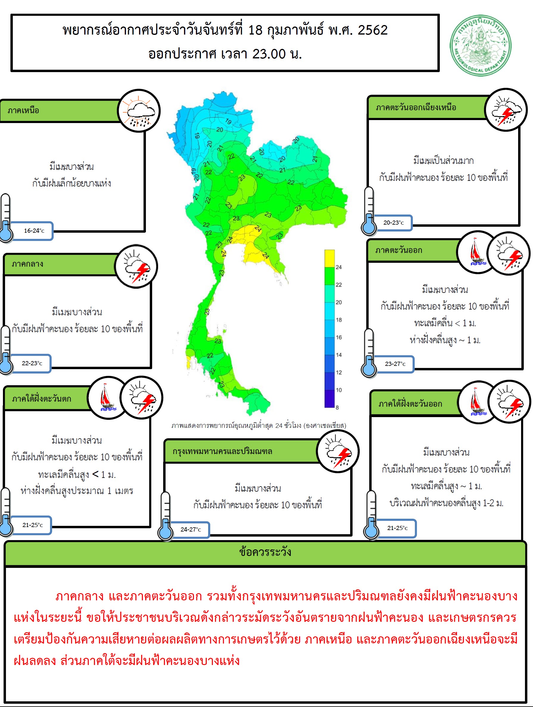 - พยากรณ์อากาศ 24 ชั่วโมงข้างหน้า ภาคกลาง และภาคตะวันออก รวมทั้งกรุงเทพมหานครและปริมณฑลยังคงมีฝนฟ้าคะนองบางแห่งในระยะนี้ ขอให้ประชาชนบริเวณดังกล่าวระมัดระวังอันตรายจากฝนฟ้าคะนอง และเกษตรกรควรเตรียมป้องกันความเสียหายต่อผลผลิตทางการเกษตรไว้ด้วย ภาคเหนือ และภาคตะวันออกเฉียงเหนือจะมีฝนลดลง ส่วนภาคใต้จะมีฝนฟ้าคะนองบางแห่ง