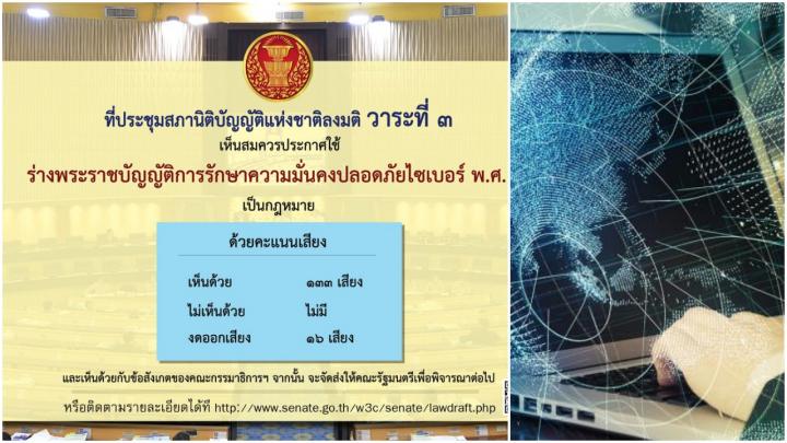 - ที่ประชุมสภานิติบัญญัติแห่งชาติ (สนช.) พิจารณาร่างพระราชบัญญัติการรักษาความมั่นคงปลอดภัยไซเบอร์ ในวาระ 3 โดยการอภิปราย และลงมติเป็นรายมาตราทั้งร่าง จำนวน 81 มาตรา ซึ่งไม่มีข้อเสนอให้แก้ไขหรือปรับปรุงแต่อย่างใด และได้มีมติเห็นชอบด้วยคะแนน 133 เสียง งดออกเสียง 16 เสียง เพื่อประกาศใช้เป็นกฎหมายอย่างเป็นทางการ สำหรับร่างพระราชบัญญัติการรักษาความมั่นคงปลอดภัยไซเบอร์นั้น มีสาระสำคัญ อาทิ กำหนดให้มีคณะกรรมการรักษาความมั่นคงปลอดภัยไซเบอร์แห่งชาติ (กมช.) ดำเนินการได้หลายประการ จากการออกคำสั่งโดยคณะกรรมการกำกับดูแลด้านความมั่นคงปลอดภัยไซเบอร์ (กกม.) เช่น รวบรวมข้อมูล หรือพยานเอกสาร พยานบุคคล พยานวัตถุที่เกี่ยวข้อง เพื่อวิเคราะห์สถานการณ์และประเมินผลกระทบจากภัยคุกคามทางไซเบอร์ เป็นต้น หรือในกรณีเกิดภัยคุกคามทางไซเบอร์ในระดับร้ายแรง ได้ให้อำนาจเลขาธิการคณะกรรมการรักษาความมั่นคงปลอดภัยไซเบอร์แห่งชาติสั่งให้พนักงานเจ้าหน้าที่เข้าไปในอสังหาริมทรัพย์ หรือสถานประกอบการที่เกี่ยวข้อง หรือคาดว่ามีส่วนเกี่ยวข้องกับภัยคุกคามทางไซเบอร์ แต่ผู้ครอบครองสถานที่นั้นต้องให้การยินยอมเข้าไปด้วย