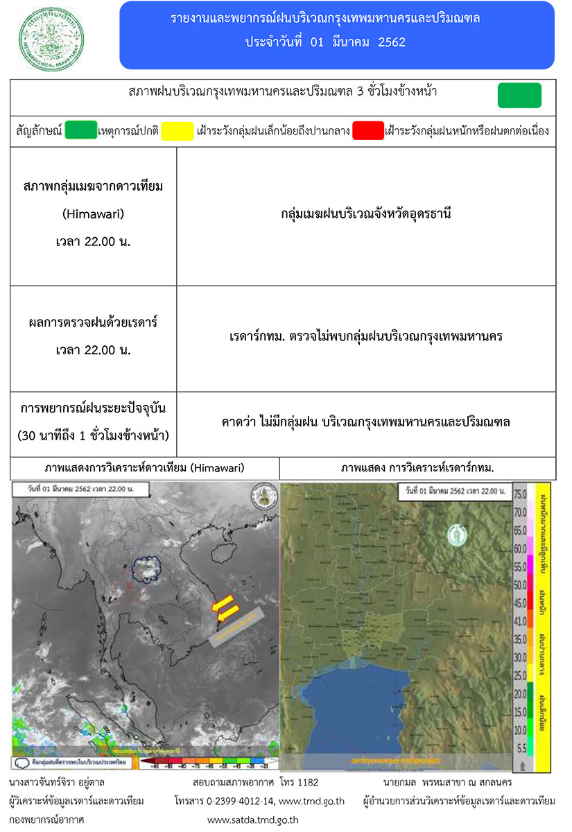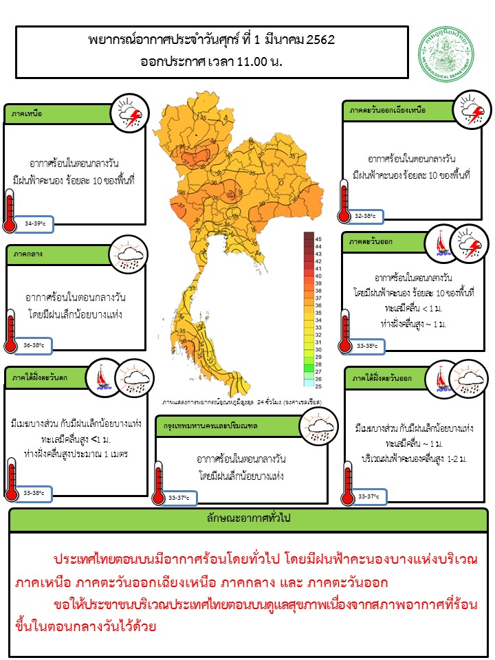 - ประเทศไทยตอนบนมีอากาศร้อนโดยทั่วไป โดยมีฝนฟ้าคะนองบางแห่งบริเวณภาคเหนือตอนล่าง ภาคตะวันออกเฉียงเหนือ ภาคกลาง และภาคตะวันออก ขอให้ประชาชนบริเวณประเทศไทยตอนบนดูแลสุขภาพเนื่องจากสภาพอากาศที่ร้อนขึ้นในตอนกลางวันไว้ด้วย
