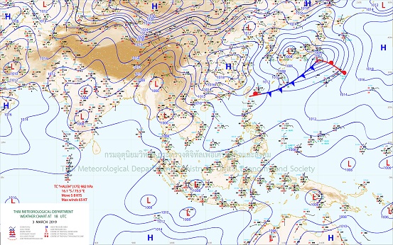 - ประเทศไทยตอนบนมีอากาศร้อนโดยทั่วไป โดยมีฝนฟ้าคะนองบางแห่งบริเวณภาคตะวันออกเฉียงเหนือ และภาคตะวันออก ส่วนในกรุงเทพมหานครและปริมณฑล มีเมฆบางส่วน กับมีอากาศร้อนในตอนกลางวัน อุณหภูมิต่ำสุด 26-27 องศาเซลเซียส อุณหภูมิสูงสุด 33-37 องศาเซลเซียส ลมใต้ ความเร็ว 10-20 กม./ชม.