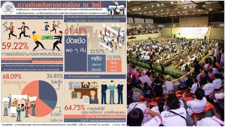 - สวนดุสิตโพล มหาวิทยาลัยสวนดุสิต สำรวจความคิดเห็นของประชาชนทั่วประเทศ จำนวนทั้งสิ้น 1,028 คน กรณีที่แต่ละพรรคการเมืองลงพื้นที่แข่งขันหาเสียงกันอย่างเข้มข้น จนทำให้หลายฝ่ายกังวลว่าการเลือกตั้งจะนำไปสู่ประเด็นที่สร้างความขัดแย้งทางการเมือง เมื่อถามถึงสาเหตุของความขัดแย้งทางการเมือง ประชาชนกว่าร้อยละ 59.22 เห็นว่าเกิดจากการแย่งชิงอำนาจและผลประโยชน์ ร้อยละ 49.02 เห็นว่าเป็นเพราะแบ่งพรรคแบ่งพวก อยู่คนละขั้ว ร้อยละ 42.35 เห็นว่าสาเหตุคือความไม่เป็นประชาธิปไตย ร้อยละ 18.43 เห็นว่าเป็นเพราะ ทัศนคติและแนวความคิดแตกต่างกัน และร้อยละ 10.59 คิดว่าความขัดแย้งมาจากการขาดจิตสำนึก คุณธรรม และจริยธรรม อีกทั้งเมื่อถามถึงวิธีการป้องกันและแก้ไขความขัดแย้ง ประชาชนกว่าร้อยละ 64.75 ตอบว่า การบังคับใช้กฎหมายเด็ดขาด การเข้มงวดกวดขัน บทลงโทษรุนแรง ร้อยละ 47.13 ตอบว่า การรับฟังความคิดเห็นซึ่งกันและกัน เห็นแก่ส่วนรวม และมีจิตสำนึก และร้อยละ 33.61 ตอบว่า การมีสติ ไม่วู่วาม และติดตามข่าวสารอย่างมีวิจารณญาณ