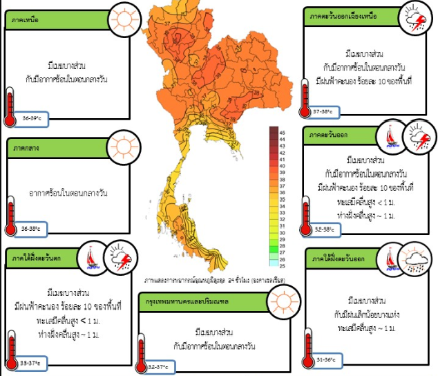 - ประเทศไทยตอนบน มีอากาศร้อนโดยทั่วไป โดยมีฝนฟ้าคะนองบางแห่งบริเวณภาคตะวันออก และภาคตะวันออกเฉียงเหนือตอนล่าง ขอให้ประชาชนบริเวณประเทศไทยตอนบนดูแลสุขภาพเนื่องจากสภาพอากาศร้อนในตอนกลางวันไว้ด้วย