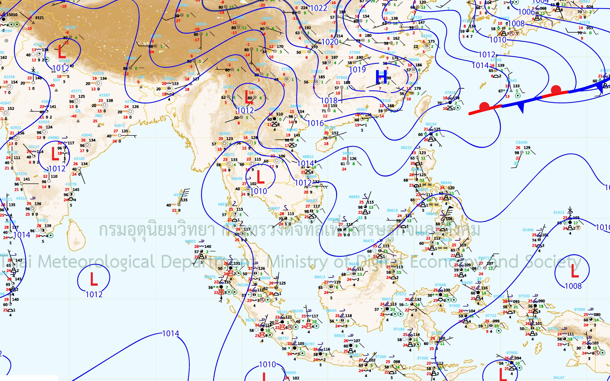 - พยากรณ์อากาศ 24 ชั่วโมงข้างหน้า ประเทศไทยตอนบนมีอากาศร้อนโดยทั่วไป โดยมีฝนฟ้าคะนองบางแห่งบริเวณภาคตะวันออกเฉียงเหนือ และภาคใต้ตอนล่าง ขอให้ประชาชนบริเวณประเทศไทยตอนบนดูแลสุขภาพเนื่องจากสภาพอากาศร้อนในตอนกลางวันไว้ด้วย อนึ่ง ในช่วงวันที่ 14-18 มีนาคม 2562 บริเวณความกดอากาศสูงจากประเทศจีนจะแผ่ลงมาปกคลุมภาคตะวันออกเฉียงเหนือตอนบน และทะเลจีนใต้ ในขณะที่ประเทศไทยตอนบนมีอากาศร้อน ทำให้ประเทศไทยตอนบน มีพายุฤดูร้อนเกิดขึ้น โดยมีลักษณะของพายุฝนฟ้าคะนอง ลมกระโชกแรง และลูกเห็บตกบางพื้นที่ โดยเริ่มจากภาคตะวันออกเฉียงเหนือและภาคตะวันออกก่อน ส่วนภาคอื่นๆ จะได้รับผลกระทบในระยะต่อไป ขอให้ประชาชนบริเวณดังกล่าวเตรียมการระมัดระวังอันตรายจากพายุฤดูร้อน และควรอยู่ห่างจากต้นไม้ใหญ่ สิ่งปลูกสร้าง รวมทั้งป้ายโฆษณาที่ไม่แข็งแรง สำหรับเกษตรกรควรระมัดระวัง และป้องกันความเสียหายต่อผลผลิตทางการเกษตรไว้ด้วย