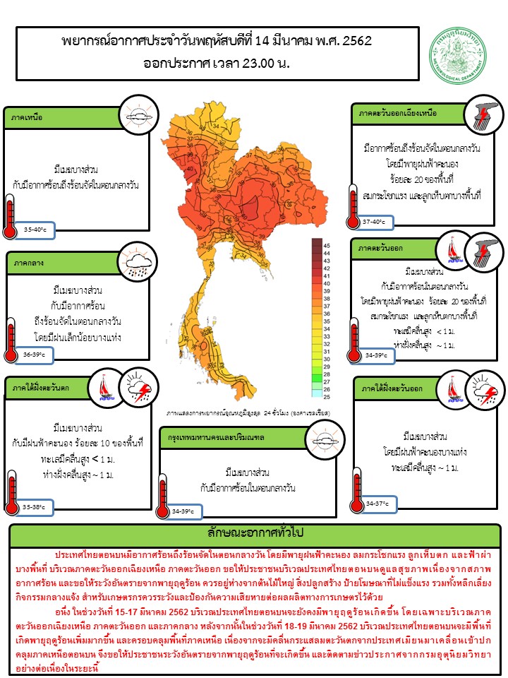 - ในช่วงวันที่ 15-17 มี.ค. 62 บริเวณประเทศไทยตอนบนจะยังคงมีพายุฤดูร้อนเกิดขึ้น โดยเฉพาะบริเวณภาคตะวันออกเฉียงเหนือ ภาคตะวันออก และภาคกลาง หลังจากนั้นในช่วงวันที่ 18-19 มี.ค. 62 บริเวณประเทศไทยตอนบนจะมีพื้นที่เกิดพายุฤดูร้อนเพิ่มมากขึ้น และครอบคลุมพื้นที่ภาคเหนือ เนื่องจากจะมีคลื่นกระแสลมตะวันตกจากประเทศเมียนมาเคลื่อนเข้าปกคลุมภาคเหนือตอนบน จึงขอให้ประชาชนระวังอันตรายจากพายุฤดูร้อนที่จะเกิดขึ้น และติดตามข่าวประกาศจากกรมอุตุนิยมวิทยาอย่างต่อเนื่องในระยะนี้