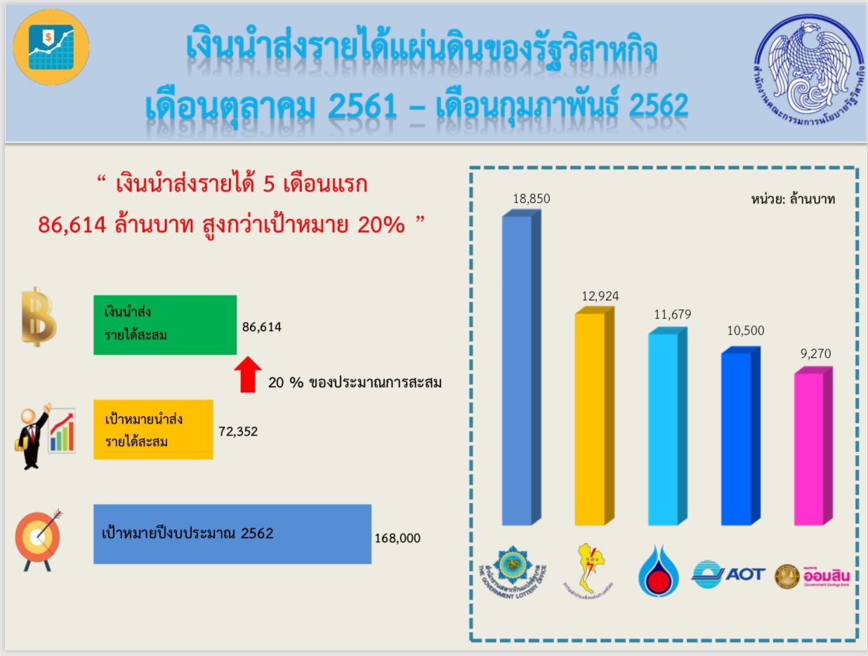 - นายประภาศ คงเอียด ผู้อำนวยการ สำนักงานคณะกรรมการนโยบายรัฐวิสาหกิจ (สคร.) เปิดเผยว่า ในช่วง 5 เดือนแรกของปีงบประมาณ 62 (เดือน ต.ค. 61-เดือน ก.พ. 62) สคร. สามารถจัดเก็บเงินนำส่งรายได้แผ่นดินจากรัฐวิสาหกิจและกิจการที่กระทรวงการคลังถือหุ้นต่ำกว่าร้อยละ 50 จำนวน 86,614 ล้านบาท ซึ่งสูงกว่าประมาณการเงินนำส่งรายได้แผ่นดินสะสม จำนวน 14,262 ล้านบาท หรือร้อยละ 20 ของประมาณการสะสม โดยรัฐวิสาหกิจที่นำส่งรายได้แผ่นดินสูงสุด 5 อันดับแรก ในช่วง 5 เดือนแรกของปีงบประมาณ 62 ได้แก่ สำนักงานสลากกินแบ่งรัฐบาล 18,850 ล้านบาท, 2.การไฟฟ้าฝ่ายผลิตแห่งประเทศไทย 12,924 ล้านบาท, 3.บริษัท ปตท. จำกัด (มหาชน) 11,679 ล้านบาท, 4.บริษัท ท่าอากาศยานไทย จำกัด (มหาชน) 10,500 ล้านบาท และ 5.ธนาคารออมสิน 9,270 ล้านบาท รวมจำนวน 63,223 ล้านบาท คิดเป็นร้อยละ 73 ของเงินนำส่งรายได้แผ่นดินสะสมทั้งหมด