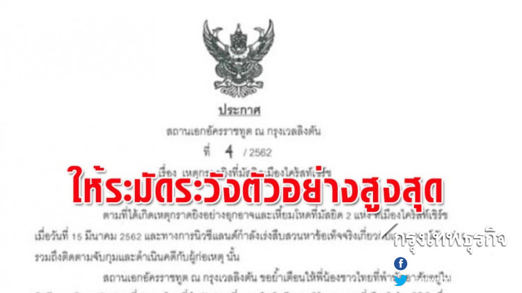 - สถานเอกอัครราชทูตไทยในเวลลิงตัน ออกประกาศฉบับที่ 4 เรื่องเหตุกราดยิงที่มัสยิดเมืองไครสต์เชิร์ชว่า ตามที่ได้เกิดเหตุกราดยิงอย่างอุกอาจ และเหี้ยมโหดที่มัสยิด 2 แห่ง เมื่อวันที่ 15 มี.ค. ที่ผ่านมา และทางการนิวซีแลนด์กำลังเร่งสืบสวนข้อเท็จจริงเกี่ยวกับเหตุการณ์ดังกล่าว รวมถึงติดตามจับกุมและดำเนินคดีกับผู้ก่อเหตุนั้น สถานเอกอัครราชทูตขอย้ำเตือนให้คนไทยที่พำนักอาศัยอยู่ในนิวซีแลนด์และนักท่องเที่ยวชาวไทย ที่กำลังท่องเที่ยวในนิวซีแลนด์ โดยเฉพาะที่เมืองไครสต์เชิร์ช ซึ่งสถานการณ์ยังมีความอ่อนไหวและมีระดับของภัยคุกคามการก่อการร้ายสูงอยู่ จึงขอให้ใช้ความระมัดระวังอย่างสูงติดตามข่าวสารจากทางการนิวซีแลนด์ รวมถึงข่าวสารจากสถานเอกอัครราชทูตอย่างใกล้ชิด และปฏิบัติตามคำแนะนำของทางการนิวซีแลนด์อย่างเคร่งครัด หากพบเหตุต้องสงสัยให้แจ้งได้ที่หมายเลขโทรศัพท์ 111 ได้ทันที และหากมีความประสงค์จะติดต่อสถานเอกอัครราชทูตสามารถติดต่อได้ที่หมายเลขโทรศัพท์ฉุกเฉิน 021896393 ตลอด 24 ชั่วโมง