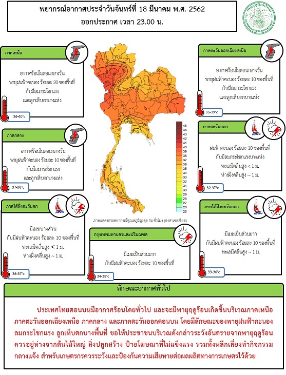 - ประเทศไทยตอนบนมีอากาศร้อนโดยทั่วไป และจะมีพายุฤดูร้อนเกิดขึ้นบริเวณภาคเหนือ และภาคตะวันออกเฉียงเหนือตอนบน โดยมีลักษณะของพายุฝนฟ้าคะนอง ลมกระโชกแรง ลูกเห็บตกบางพื้นที่ ขอให้ประชาชนบริเวณดังกล่าวระวังอันตรายจากพายุฤดูร้อน ควรอยู่ห่างจากต้นไม้ใหญ่ สิ่งปลูกสร้าง ป้ายโฆษณาที่ไม่แข็งแรง รวมทั้งหลีกเลี่ยงทำกิจกรรมกลางแจ้ง สำหรับเกษตรกรควรระวังและป้องกันความเสียหายต่อผลผลิตทางการเกษตรไว้ด้วย