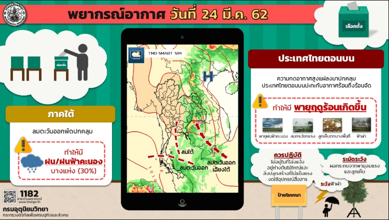ในช่วงวันที่ 23-27 มีนาคม 2562 ประเทศไทยตอนบนจะมีพายุฤดูร้อนเกิดขึ้น โดยมีลักษณะของพายุฝนฟ้าคะนอง ลมกระโชกแรง และมีลูกเห็บตกบางพื้นที่รวมถึงมีฟ้าผ่า โดยจะเริ่มจากภาคตะวันออกเฉียงเหนือและภาคตะวันออกก่อน ส่วนภาคกลางและภาคเหนือจะได้รับผลกระทบในวันถัดไป จึงขอให้ประชาชนบริเวณดังกล่าวระวังอันตรายจากพายุฤดูร้อนที่จะเกิดขึ้น โดยหลีกเลี่ยงการอยู่ในที่โล่งแจ้ง ใต้ต้นไม้ใหญ่ สิ่งปลูกสร้างและป้ายโฆษณาที่ไม่แข็งแรง รวมถึงระวังอันตรายจากฟ้าผ่า สำหรับเกษตรกรควรเตรียมการป้องกันและระวังความเสียหายที่จะเกิดต่อผลผลิตทางการเกษตรไว้ด้วย สำหรับ กรุงเทพมหานครและปริมณฑล มีเมฆบางส่วน กับมีอากาศร้อนถึงร้อนจัดในตอนกลางวัน