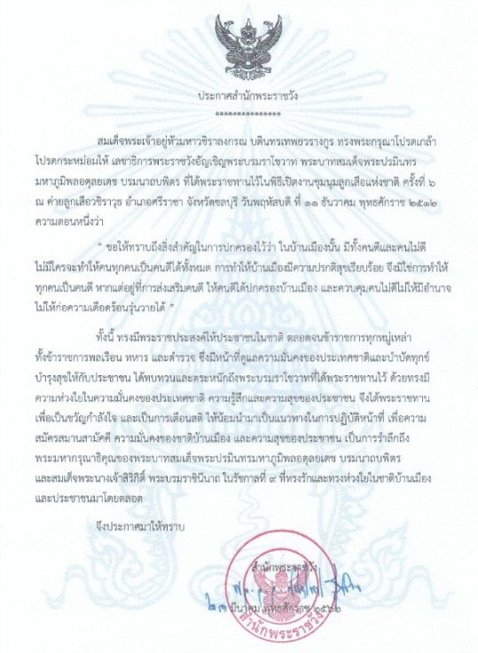 - วันที่ 23 มี.ค. สำนักพระราชวังออกประกาศสำนักพระราชวัง ความว่า สมเด็จพระเจ้าอยู่หัวมหาวชิราลงกรณ บดินทรเทพยวรางกูร ทรงพระกรุณาโปรดเกล้าโปรดกระหม่อมให้ เลขาธิการพระราชวังอัญเชิญพระบรมราโชวาท พระบาทสมเด็จพระปรมินทรมหาภูมิพลอดุลยเดช บรมนาถบพิตร ที่ได้พระราชทานไว้ในพิธีเปิดงานชุมนุมลูกเสือแห่งชาติ ครั้งที่ 6 ณ ค่ายลูกเสือวชิราวุธ อำเภอศรีราชา จังหวัดชลบุรี วันพฤหัสบดีที่ 11 ธันวาคม พุทธศักราช 2532 ความตอนหนึ่งว่า“ขอให้ทราบถึงสิ่งสำคัญในการปกครองไว้ว่า ในบ้านเมืองนั้น มีทั้งคนดีและคนไม่ดี ไม่มีใครจะทำให้คนทุกคนเป็นคนดีได้ทั้งหมด การทำให้บ้านเมืองมีความปรกติสุขเรียบร้อย จึงมิใช่การทำให้ทุกคนเป็นคนดี หากแต่อยู่ที่การส่งเสริมคนดี ให้คนดีได้ปกครองบ้านเมือง และควบคุมคนไม่ดีไม่ให้มีอำนาจ ไม่ให้ก่อความเดือดร้อนวุ่นวายได้” ทั้งนี้ ทรงมีพระราชประสงค์ให้ประชาชนในชาติ ตลอดจนข้าราชการทุกหมู่เหล่า ทั้งข้าราชการพลเรือน ทหาร และตำรวจ ซึ่งมีหน้าที่ดูแลความมั่นคงของประเทศชาติและบำบัดทุกข์บำรุงสุขให้กับประชาชน ได้ทบทวนและตระหนักถึงพระบรมราโชวาทที่ได้พระราชทานไว้ด้วยทรงมีความห่วงใยในความมั่นคงของประเทศชาติ ความรู้สึกและความสุขของประชาชน จึงได้พระราชทานเพื่อเป็นขวัญกำลังใจ และเป็นการเตือนสติ ให้น้อมนำมาเป็นแนวทางในการปฏิบัติหน้าที่ เพื่อความสมัครสมานสามัคคี ความมั่นคงของชาติบ้านเมือง และความสุขของประชาชน เป็นการรำลึกถึงพระมหากรุณาธิคุณของพระบาทสมเด็จพระปรมินทรมหาภูมิพลอดุลยเดช บรมนาถบพิตร และสมเด็จพระนางเจ้าสิริกิติ์ พระบรมราชินีนาถ ในรัชกาลที่ 9 ที่ทรงรักและทรงห่วงใยในชาติบ้านเมือง และประชาชนมาโดยตลอด