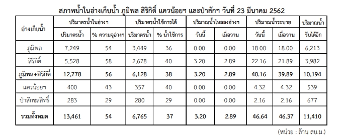 ปริมาณน้ำใช้การได้ในอ่างเก็บน้ำหลักของแม่น้ำเจ้าพระยา ได้แก่ เขื่อนภูมิพล เขื่อนสิริกิติ์ เขื่อนแควน้อยบำรุงแดน และเขื่อนป่าสักชลสิทธิ์ มีปริมาณทั้งสิ้น 13,461 ล้าน ลบ.ม. น้อยกว่าวันเดียวกันของปี 2561 จำนวน 2,137 ล้าน ลบ.ม. และในช่วงนี้จะพบว่ามีปริมาณน้ำไหลลงอ่างรวมประมาณ 3.20 ล้าน ลบ.ม. ต่อวัน ขณะที่ปริมาณน้ำระบายอยู่ที่ประมาณ 46.64 ล้าน ลบ.ม. ต่อวัน - สถานการณ์อากาศ