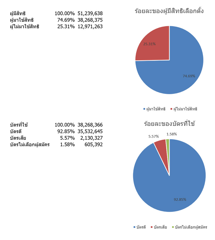 - คณะกรรมการการเลือกตั้ง (กกต.) ได้แถลงผลการนับคะแนนการเลือกตั้งสมาชิกสภาผู้แทนราษฎร หลังจากตรวจสอบการนับครบแล้ว 100% พบว่า มีผู้มีสิทธิเลือกตั้งคิดเป็น 100 เปอร์เซ็นต์ จำนวน 51,239,638 คน มีผู้มาใช้สิทธิ คิดเป็น 74.69 เปอร์เซ็นต์ จำนวน 38,268,375 คน และผู้ไม่มาใช้สิทธิ คิดเป็น 25.31 เปอร์เซ็นต์ จำนวน 12,971,263 คน ขณะที่จำนวนบัตรเลือกตั้ง รวมทั้งสิ้น 38,268,366 บัตร คิดเป็นบัตรดี 92.85 เปอร์เซ็นต์ จำนวน 35,532,645 บัตร ส่วนบัตรเสีย คิดเป็น 5.57 เปอร์เซ็นต์ จำนวน 2,130,327 บัตร และบัตรไม่ประสงค์จะเลือกผู้ใด คิดเป็นร้อยละ 1.58 จำนวน 605,392 บัตร