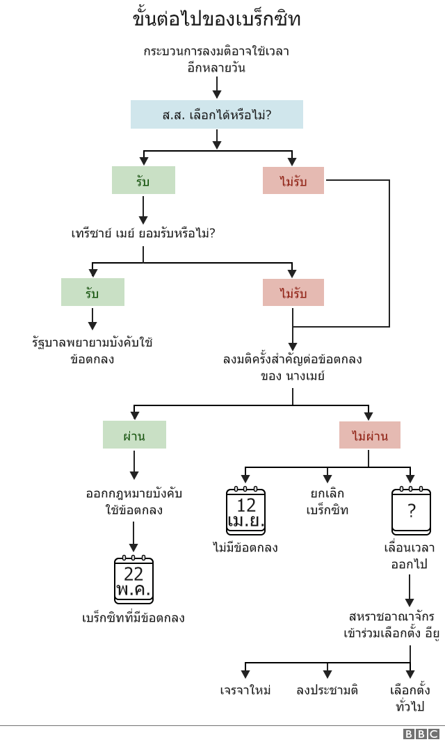 - สมาชิกสภาผู้แทนราษฎรอังกฤษลงมติไม่รับร่างข้อตกลงถอนตัวออกจากสหภาพยุโรป (เบร็กซิท) ของนายกรัฐมนตรีเทรีซา เมย์ เป็นครั้งที่ 3 ด้วยมติ 344 ต่อ 286 เสียง ทำให้กระบวนการถอนตัวจากอียูเข้าสู่ความยุ่งยากมากขึ้น โดยผลของการการลงมตินี้ ส่งผลให้มีโอกาสสูงที่สหราชอาณาจักรอาจจะต้องออกจากสหภาพยุโรปตามกำหนดในวันที่ 12 เม.ย. นี้โดยไม่มีข้อตกลงนางเมย์ กล่าวว่า มติที่ออกมานี้ เป็นเรื่อง “ที่น่าเสียใจยิ่ง” และ “ความล้มเหลวทางกฎหมาย” นี้ ส่งผลให้สหราชอาณาจักรจะต้องออกจากสหภาพยุโรปในวันที่ 12 เม.ย. นี้ นั่นหมายความว่า จะไม่มีเวลาที่เพียงพอในการทำกระบวนการทางกฎหมายเพื่อเลี่ยงเบร็กซิทที่ไม่มีข้อตกลง ด้านนายเจเรมีย์ คอร์บิน ผู้นำฝ่ายค้าน เรียกร้องให้นายกรัฐมนตรีลาออกและจัดการเลือกตั้งทั่วไปใหม่ โดยกระบวนการต่อไปของ Brexit ระบุไว้ ตามภาพ