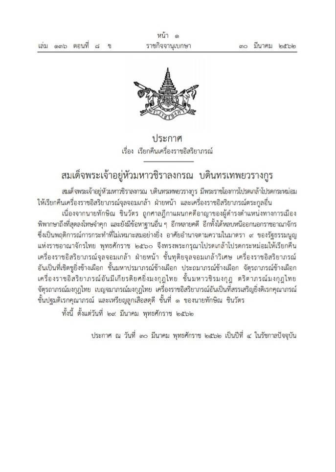 - สมเด็จพระเจ้าอยู่หัวมีพระราชโองการโปรดเกล้าฯ เรียกคืนเครื่องราชฯ นายทักษิณ ชินวัตร เนื่องจากถูกศาลฎีกาพิพากษาจำคุก และได้หนีคดีไปนอกราชอาณาจักร ซึ่งเป็นพฤติการณ์การกระทำที่ไม่เหมาะสมอย่างยิ่ง