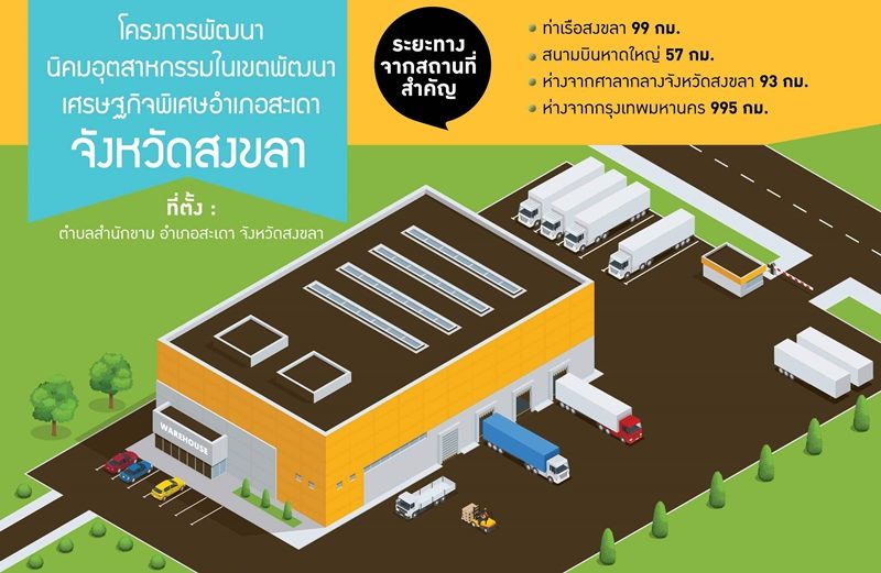 - น.ส. สมจิณณ์ พิลึก ผู้ว่าการการนิคมอุตสาหกรรมแห่งประเทศไทย (กนอ.) เปิดเผยถึงความคืบหน้าการพัฒนาโครงการนิคมอุตสาหกรรมสงขลาในเขตพัฒนาเศรษฐกิจพิเศษ (เอสอีแซด) อำเภอสะเดา จังหวัดสงขลา ระยะที่ 1 พื้นที่ 629 ไร่ ว่าขณะนี้ กนอ. พร้อมเข้าพัฒนาพื้นที่แล้ว โดยบริษัท พี.ที.เอ.คอนสตรัคชั่น จำกัด ซึ่งเป็นผู้รับเหมาก่อสร้างโครงการที่ กนอ. คัดเลือกและให้เป็นผู้พัฒนาพื้นที่ โดยจะเริ่มดำเนินการภายในเดือน เม.ย. นี้ ด้วยเงินลงทุน ประมาณ 900 ล้านบาท คาดจะใช้เวลาก่อสร้างแล้วเสร็จภายใน 18 เดือน และพร้อมเปิดให้นักลงทุนเข้าใช้พื้นที่ได้ภายในปี 2563