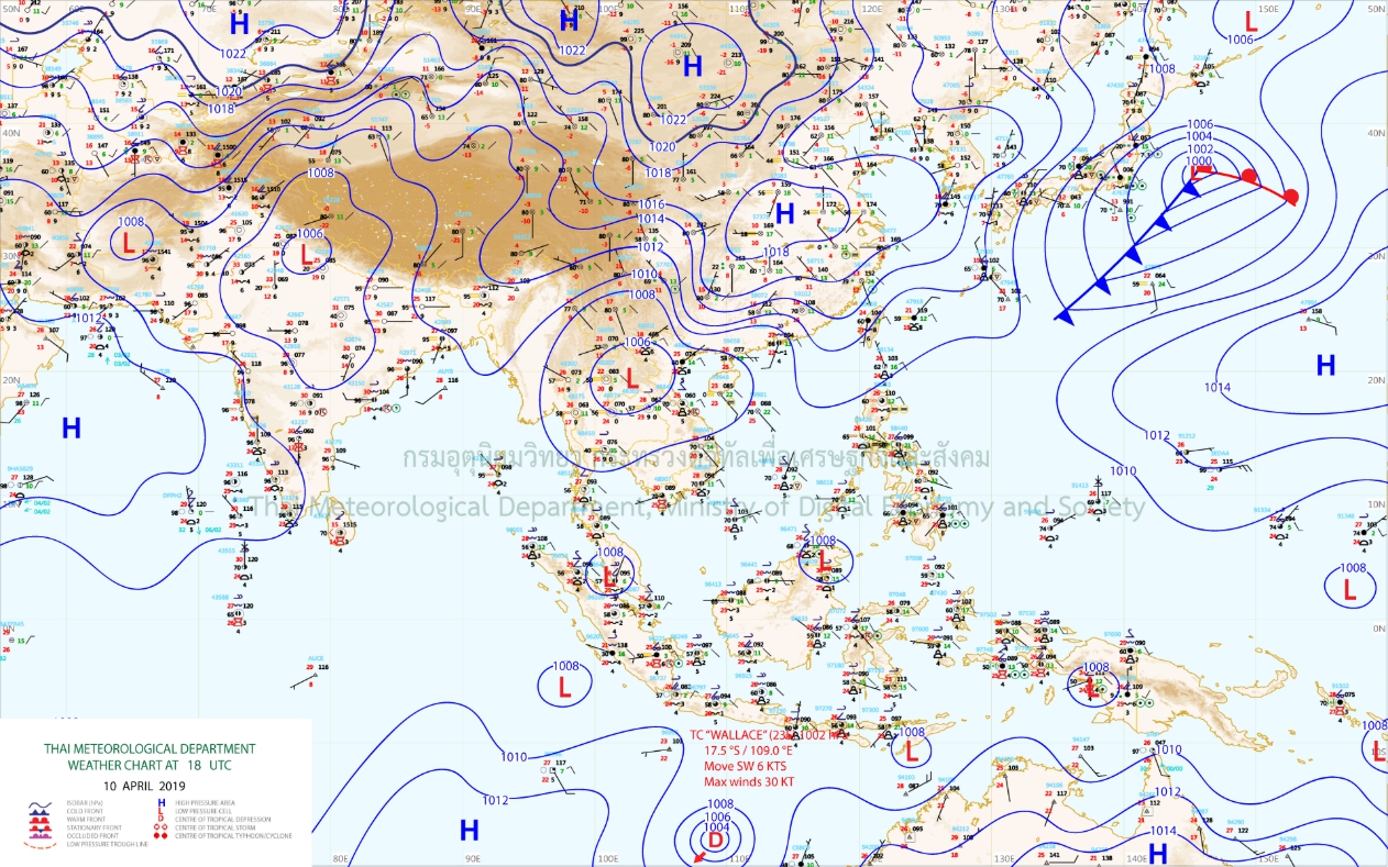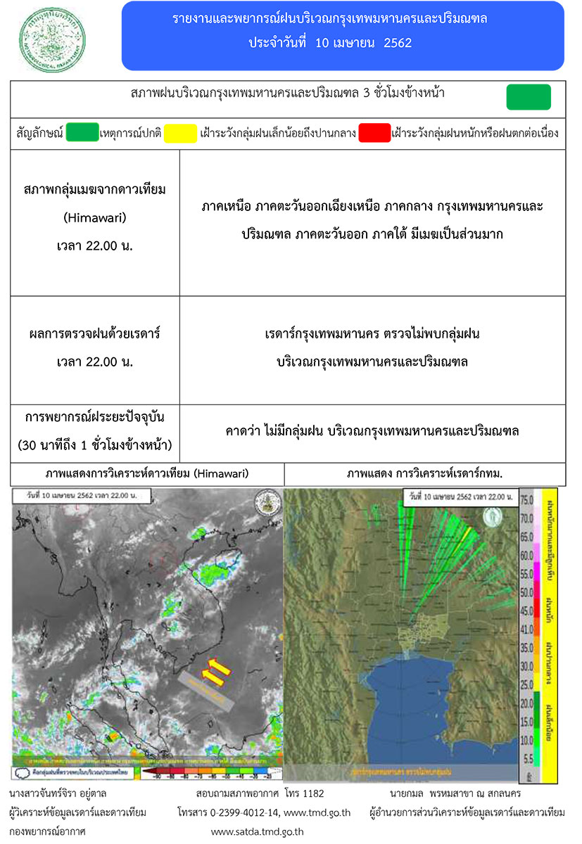 - ประเทศไทยตอนบนมีอากาศร้อนโดยทั่วไปกับมีอากาศร้อนจัดบริเวณภาคเหนือ ภาคตะวันออกเฉียงเหนือ และภาคกลาง โดยมีฝนฟ้าคะนองบางแห่งในภาคเหนือตอนล่าง ภาคตะวันออกเฉียงเหนือตอนล่าง ภาคตะวันออก ภาคกลาง และภาคใต้ ขอให้ประชาชนบริเวณประเทศไทยตอนบนดูแลสุขภาพเนื่องจากสภาพอากาศร้อนในระยะนี้ไว้ด้วย ด้าน กทม. และปริมณฑลอากาศร้อนในตอนกลางวัน อุณหภูมิต่ำสุด 26-27 องศาเซลเซียส อุณหภูมิสูงสุด 34-39 องศาเซลเซียส ลมใต้ ความเร็ว 10-20 กม./ชม.
