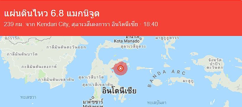 - สำนักงานสำรวจธรณีวิทยาสหรัฐ (ยูเอสจีเอส) เผยว่า เมื่อเวลาประมาณ 18.40 น. วันที่ 12 เม.ย. เกิดเหตุแผ่นดินไหวขนาด 6.8 ที่อินโดนีเซีย โดยมีจุดศูนย์กลางที่อ่าวโตโลนอกชายฝั่งทางตะวันออกของเกาะสุลาเวสี และมีความลึก 17 กม. เจ้าหน้าที่ทางการอินโดนีเซียได้ออกประกาศคำเตือนคลื่นยักษ์ ‘สึนามิ’ โดยให้ประชาชนที่อาศัยอยู่ตามแนวชายฝั่งทะเลอพยพขึ้นที่สูงเพราะอาจเกิดสึนามิตามมาหลังแผ่นดินไหวรุนแรง อย่างไรก็ตาม เบื้องต้น ยังไม่มีรายงานความเสียหาย รวมทั้งผู้บาดเจ็บ หรือเสียชีวิตจากเหตุแผ่นดินไหวครั้งนี้