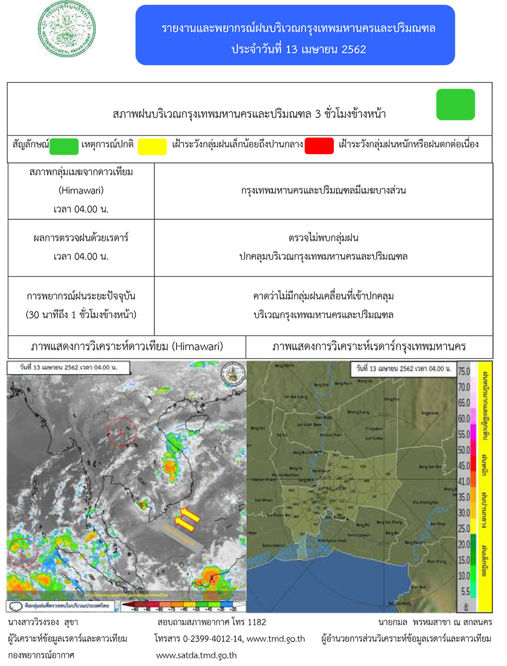 - ประเทศไทยตอนบนมีอากาศร้อนโดยทั่วไปกับมีอากาศร้อนจัดบริเวณภาคเหนือ ภาคตะวันออกเฉียงเหนือ และภาคกลาง โดยมีฝนฟ้าคะนองบางแห่งในภาคเหนือตอนล่าง ภาคตะวันออกเฉียงเหนือ ภาคตะวันออก ภาคกลาง และภาคใต้ ขอให้ประชาชนบริเวณประเทศไทยตอนบนดูแลสุขภาพเนื่องจากสภาพอากาศร้อนในระยะนี้ไว้ด้วย อนึ่งในช่วงวันที่ 13 – 16 เม.ย. 62 บริเวณความกดอากาศสูงจากประเทศจีนจะแผ่ลงมาปกคลุมภาคตะวันออกเฉียงเหนือและทะเลจีนใต้ ในขณะที่บริเวณประเทศไทยตอนบนมีอากาศร้อน ทำให้บริเวณภาคเหนือตอนล่าง ภาคตะวันออกเฉียงเหนือ ภาคกลาง และภาคตะวันออก มีพายุฤดูร้อนเกิดขึ้นโดยมีลักษณะของพายุฝนฟ้าคะนอง ลมกระโชกแรง และลูกเห็บตกบางพื้นที่ รวมถึงฟ้าผ่าได้