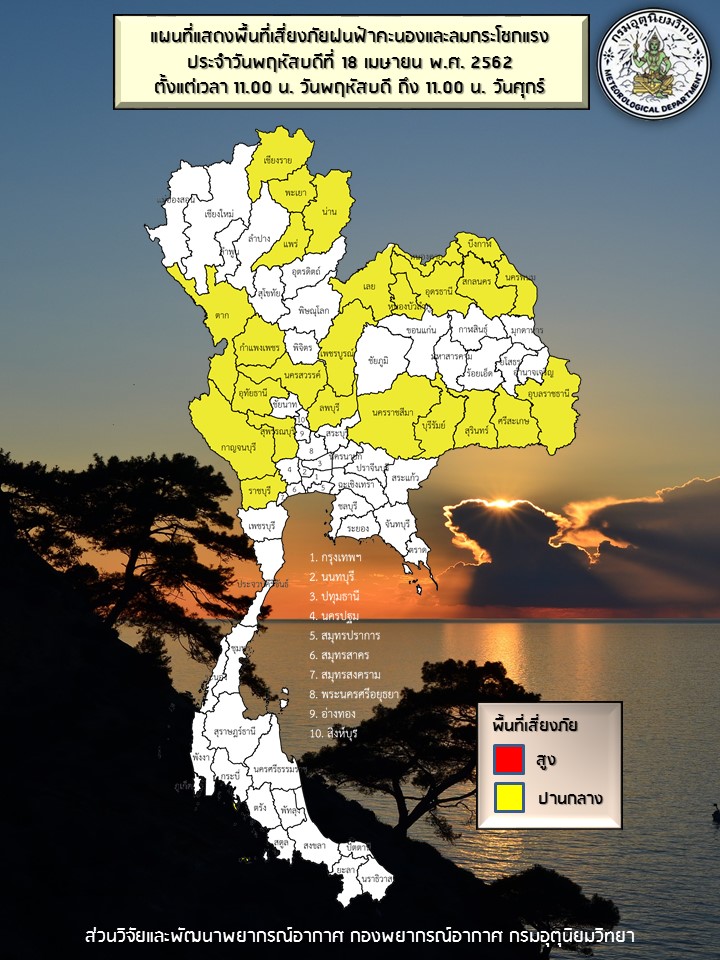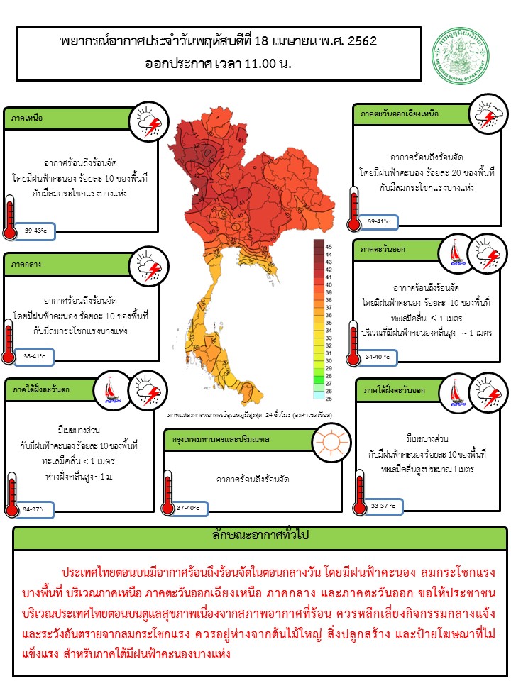- ประเทศไทยตอนบนมีอากาศร้อนถึงร้อนจัด โดยมีฝนฟ้าคะนอง ลมกระโชกแรงบางพื้นที่ บริเวณภาคเหนือ ภาคตะวันออกเฉียงเหนือ ภาคกลาง และภาคตะวันออก ขอให้ประชาชนบริเวณประเทศไทยตอนบนดูแลสุขภาพเนื่องจากสภาพอากาศที่ร้อน ควรหลีกเลี่ยงกิจกรรมกลางแจ้ง และระวังอันตรายจากลมกระโชกแรง ควรอยู่ห่างจากต้นไม้ใหญ่ สิ่งปลูกสร้าง และป้ายโฆษณาที่ไม่แข็งแรง สำหรับภาคใต้มีฝนฟ้าคะนองบางแห่ง