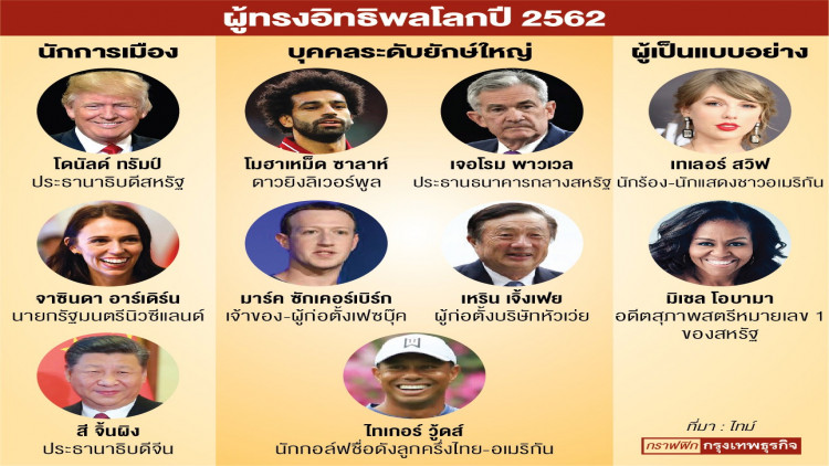 นิตยสารไทม์ จัดอันดับ100 บุคคลทรงอิทธิพลของโลก โดยจัดให้ประธานาธิบดีโดนัลด์ ทรัมป์ ของสหรัฐเป็นผู้ทรงอิทธิพลของโลกในกลุ่มนักการเมือง ในฐานะที่เข้าร่วมการประชุมสุดยอดกับคิม จองอึน ผู้นำเกาหลีเหนือ ต่อต้านสมาชิกองค์การสนธิสัญญาป้องกันแอตแลนติกเหนือ (นาโต) ที่จ่ายเงินสนับสนุนอย่างไม่เป็นธรรม และสุดท้ายคือการที่ถอนสหรัฐออกจากข้อตกลงนิวเคลียร์กับอิหร่าน ตามมาด้วยนายกรัฐมนตรีจาซินดา อาร์เดิร์น ของนิวซีแลนด์ ที่ได้รับการยกย่องจากนายซาดิก ข่าน นายกเทศมนตรีกรุงลอนดอน กรณีการรับมือเหตุกราดยิงที่มัสยิด 2 แห่ง ในเมืองไครสต์เชิร์ชได้อย่างรวดเร็ว โดยเฉพาะการปฏิรูปกฎหมายควบคุมอาวุธปืน