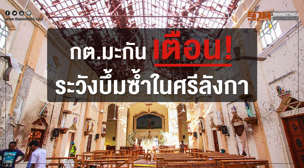 - กต. มะกันเตือน! ระวังบึ้มซ้ำในศรีลังกา – กระทรวงการต่างประเทศสหรัฐอเมริกาออกแถลงการณ์เตือนการเดินทางไปศรีลังกาฉบับแก้ไขเมื่อวันที่ 21 เมษายน 2562 ระบุว่า กลุ่มก่อการร้ายยังคงมีแผนก่อเหตุโจมตีครั้งใหม่ จึงมีความเป็นไปได้ที่จะเกิดเหตุการณ์โจมตีโบสถ์และโรงแรมในประเทศศรีลังกาได้อีก แถลงการณ์ดังกล่าวเกิดขึ้นหลังจากที่เกิดเหตุระเบิด 8 จุดในกรุงโคลัมโบ เมืองหลวงของประเทศศรีลังกา เมื่อวันอาทิตย์ที่ผ่านมา (21 เม.ย. 62) ซึ่งตรงกับวันอีสเตอร์ หรือวันเฉลิมฉลองการคืนพระชนม์ชีพของพระเยซูคริสต์ โดยเหตุการณ์รุนแรงดังกล่าวส่งผลให้มีผู้เสียชีวิตกว่า 290 คน และบาดเจ็บอีกจำนวนมาก รวมถึงชาวต่างชาติเนื่องจากคนร้ายมุ่งโจมตีโบสถ์คริสต์และโรงแรมใหญ่ เพื่อดึงดูดความสนใจจากประชาคมโลกให้มากที่สุด